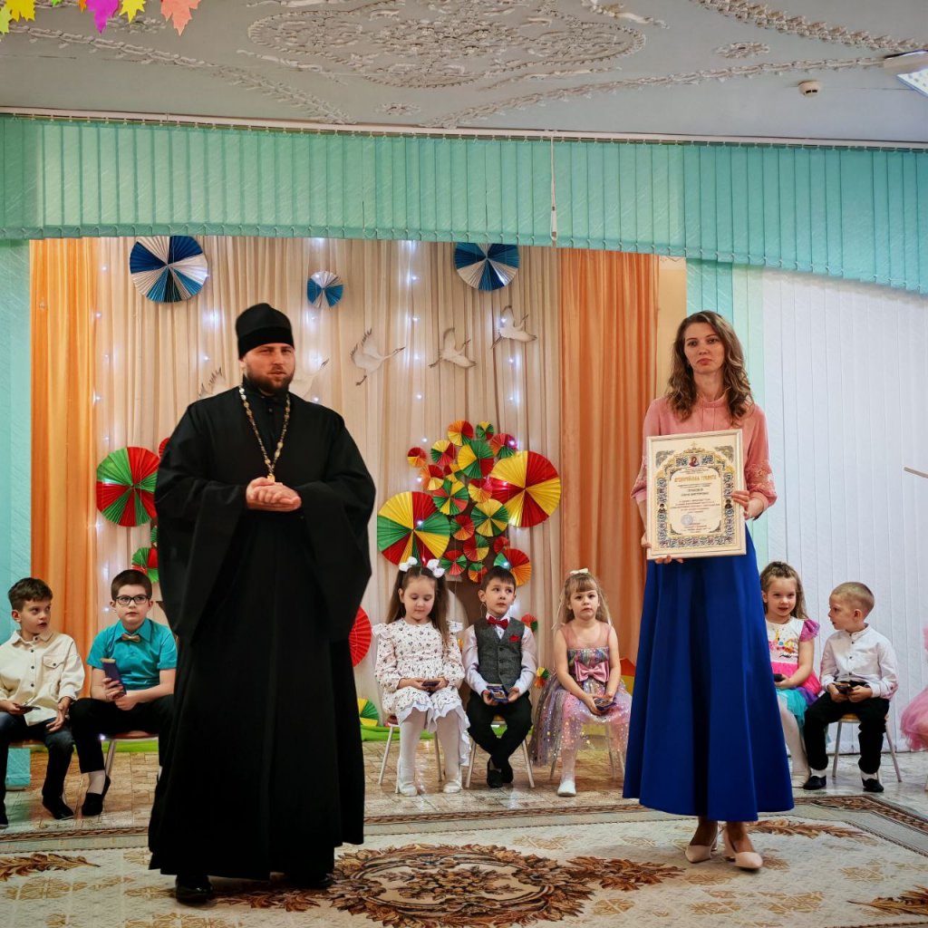 В завершение праздника отец Алексей вручил каждому юному артисту сладкий подарок, похвалив ребят за их старания. Не остались без внимания и те, кто ежедневно вкладывают душу в воспитание подрастающего поколения. Благодарственными грамотами были отмечены наставники, активно работающие в области духовно-нравственного воспитания: заместитель заведующего по основной деятельности Мария Леонидовна Шачанок и воспитатель дошкольного образования Елена Викторовна Серакова.