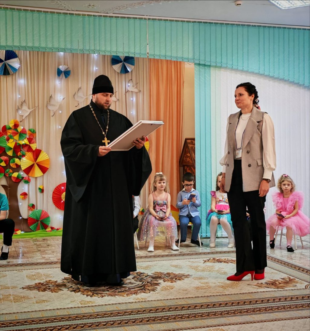 В завершении встречи иерей Алексей Сергеев выразил благодарность за многолетние труды и значительный вклад на благо духовного просвещения детей и их родителей администрации дошкольного учреждения: заведующему - Маголло Татьяне Михайловне и заместителю заведующего по основной деятельности - Куприяшенко Ольге Константиновне – и вручил им Почётные грамоты.