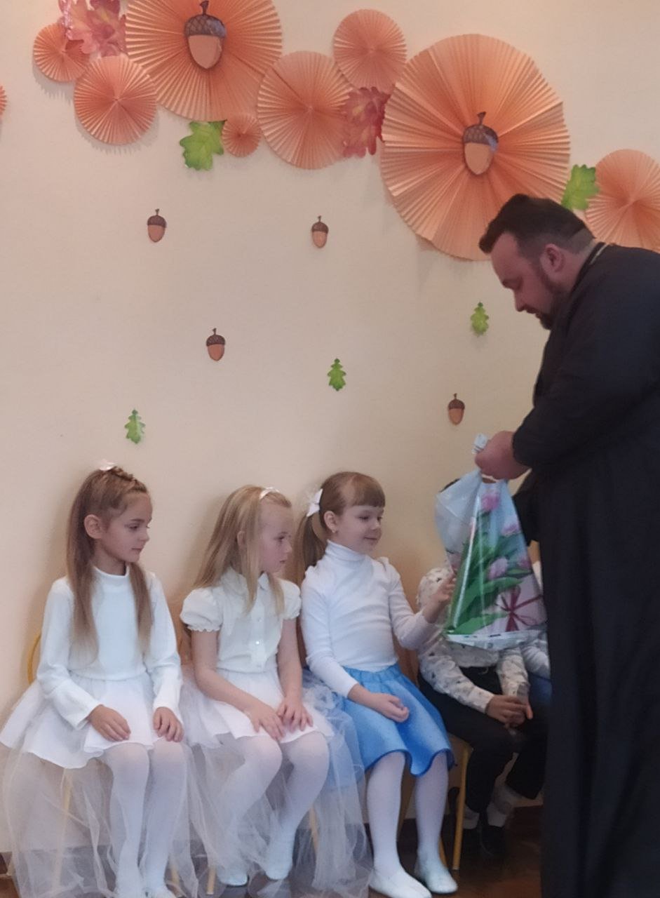 Иерей Игорь Ковальчук поздравил воспитанников, родителей и весь коллектив учреждения образования с Покровом Пресвятой Богородицы, поблагодарил за прекрасное представление ребят и педагогов, вручил детям сладкие подарки.
