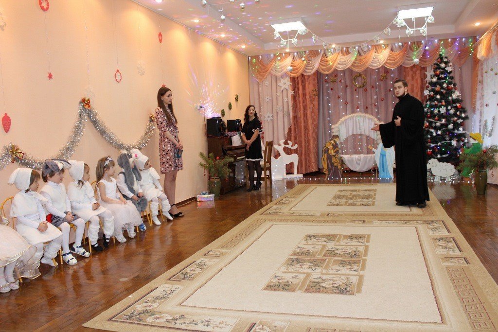 Праздничное представление «Дарит мгновения волшебства светлый праздник Рождества» в санаторном яслях-саду №4 г.Рогачева 11 ноября посетил настоятель прихода храма Святого Духа аг.Дворец протоиерей Владимир Янчесов. Трогательную рождественскую историю подготовили воспитанники старшей группы. Чарующий звон колокольчиков и рукотворная красота экспонатов выставки семейного творчества уже с порога манили в удивительный мир рождественского леса. В театрализованной миниатюре представили ребята вниманию зрителей святочную историю. Славили пришествие в мир Спасителя вода и звёзды, пастухи и овечки. Дети дарили родившемуся Богомладенцу стихи и песни, играли Ему на музыкальных инструментах. Протоиерей Владимир Янчесов не только поздравил всех с Рождеством Христовым, но и проверил знания ребят об истории рождения Господа нашего Иисуса Христа в мини-викторине. Вручив подарки детям, священник передал саду свою картину с изображением храма Святого Духа и пригласил всех почаще бывать в церкви. Благодаря стараниям воспитанников и педагогов Ковырзиной Екатерины Александровны, Скорых Регины Ермековны, а также музыкального руководителя Волчковой Аллы Викторовны праздник подарил зрителям рождественскую радость.