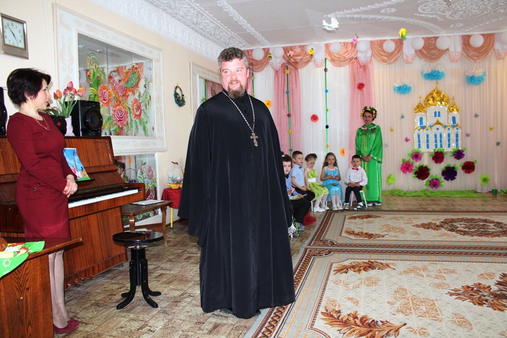 2 мая праздничное мероприятие, посвящённое Светлому Христову Воскресению прошло в яслях-саду №13. Дорогих гостей, как принято в праздник, встречали куличами и щедро дарили стихотворения и песни, прославляющие Спасителя. Пасхальное настроение в выступлении ребят старшей группы передавалось гостям, и радостно звучало пасхальное благовестие "Христос Воскресе! Воистину Воскресе!" На праздник к ребятам заглянула Весна, закружив детей в весёлом хороводе и порадовав пасхальными играми. Особый интерес ребят и взрослых вызвали поучительные инсценировки об Ангеле Хранителе и пасхальном яичке. Поздравления со Светлым Христовым Воскресением прозвучали от Кондратенко Елены Дмитриевны, заведующего учреждением образования, и клирика прихода храма святого благоверного князя Александра Невского протоиерея Георгия Мартышевского. Священник поблагодарил ребят,