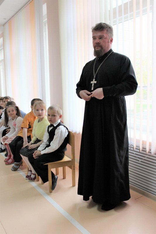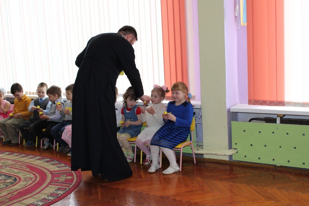 Эстафету Пасхальных утренников 21 апреля подхватил ясли-сад №13 группа с детьми трех - четырех лет радостно пели и плясали вместе с весной и солнышком встречая Воскресение Христово. Протоиерей Алексей Смотрицкий поздравил детей и их родителей с праздником и вручил пасхальные сувениры.