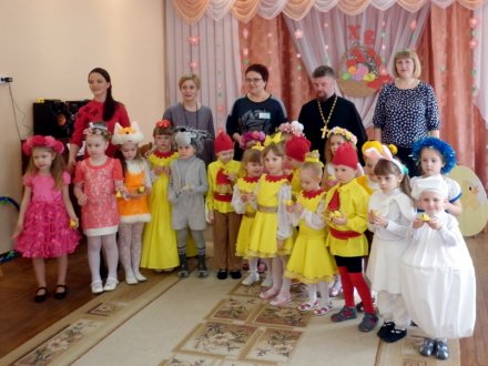 20 апреля в Санаторный ясли-сад №4 вместе с танцующим Солнышком и его Лучиками пришла Весна, чтобы поздравить ребят православной группы со Светлым Христовым Воскресением. Праздник "Пасхальный звон" подарил малышам и их родителям много светлых и радостных минут. В исполнении ребят трогательно и искренне звучали пасхальные стихотворения и песни, а очаровательные бабочки порадовали зрителей настоящим весенним танцем. В весенних забавах не забыли и про традиции празднования Пасхи. Сколько радости и восторга вызвала игра "Пасхальное яичко"! Неожиданным подарком стала для малышей народная сказка "Кот и Петушок" в кукольной пасхальной интерпретации. Протоиерей Владимир Янчесов, настоятель прихода храма Святого Духа в д. Дворец, в прошлом воспитанник этого детского сада, поздравил ребят и взрослых с Пасхой Господней, пожелал сохранить это праздничное настроение в своей душе, поблагодарил за замечательное представление и вручил всем подарки.