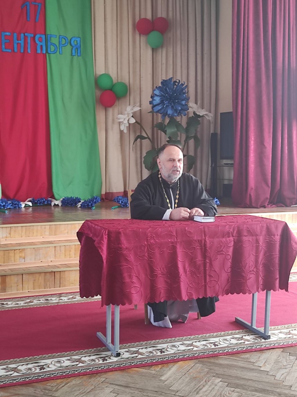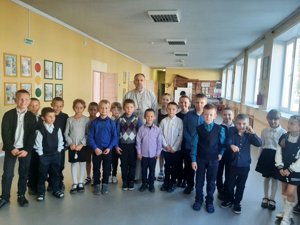 Накануне двунадесятого праздника настоятель прихода храма Покрова Пресвятой Богородицы в аг.Довск протоиерей Виталий Левчук посетил местную школу, где встретился с первоклассниками и рассказал им о Рождестве Божией Матери.