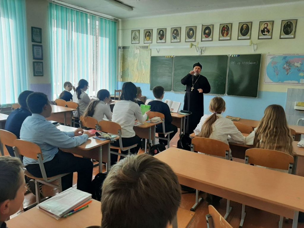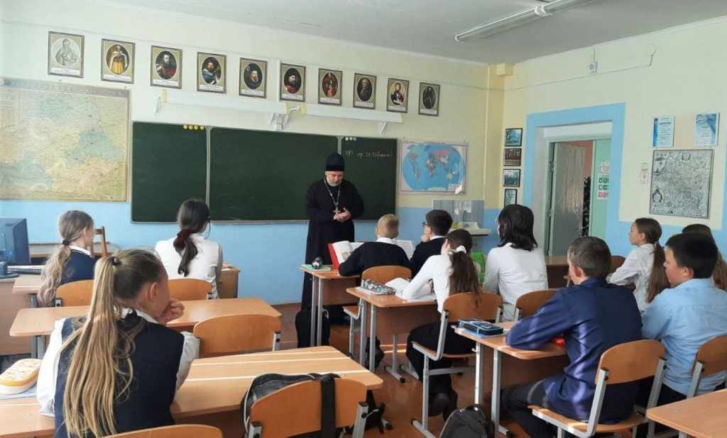 Беседа была посвящена святым праведным богоотцам Иоакиму и Анне, которые несмотря на долгие годы ожиданий, благодатно обрели от Бога Дочь Марию, ставшую Матерью Божией. Священнослужитель отметил старшеклассникам, что ранее супруги не расставались, не бросали друг друга ни в бездетности, ни в любой другой беде. А вместе молились Богу, доверяли Ему во всём.