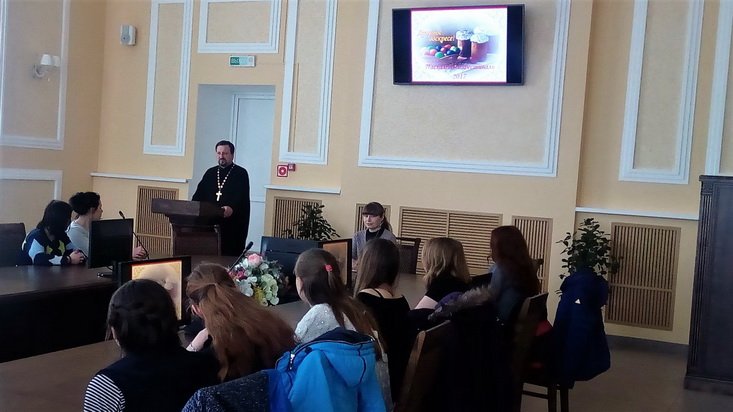 Протоиерей Александр Атрощенко, священнослужитель прихода храма святого благоверного князя Александра Невского, встретился со студентами строительного колледжа. Беседу «Этот светлый праздник Пасха» начала библиотекарь Пыряева Н.В.: «Праздник светлого Христова Воскресения – главное событие года для православных христиан. Это Праздник праздников и Торжество из торжеств. К нему христиане готовятся длительным семинедельным постом и отмечают его очень радостно. Но многое в значении этого торжества оказывается не совсем понятным для нас». Отец Александр рассказал ребятам об истории праздника Светлого Христова Воскресения, объяснил его значение для каждого из нас и ответил на вопросы студентов.