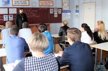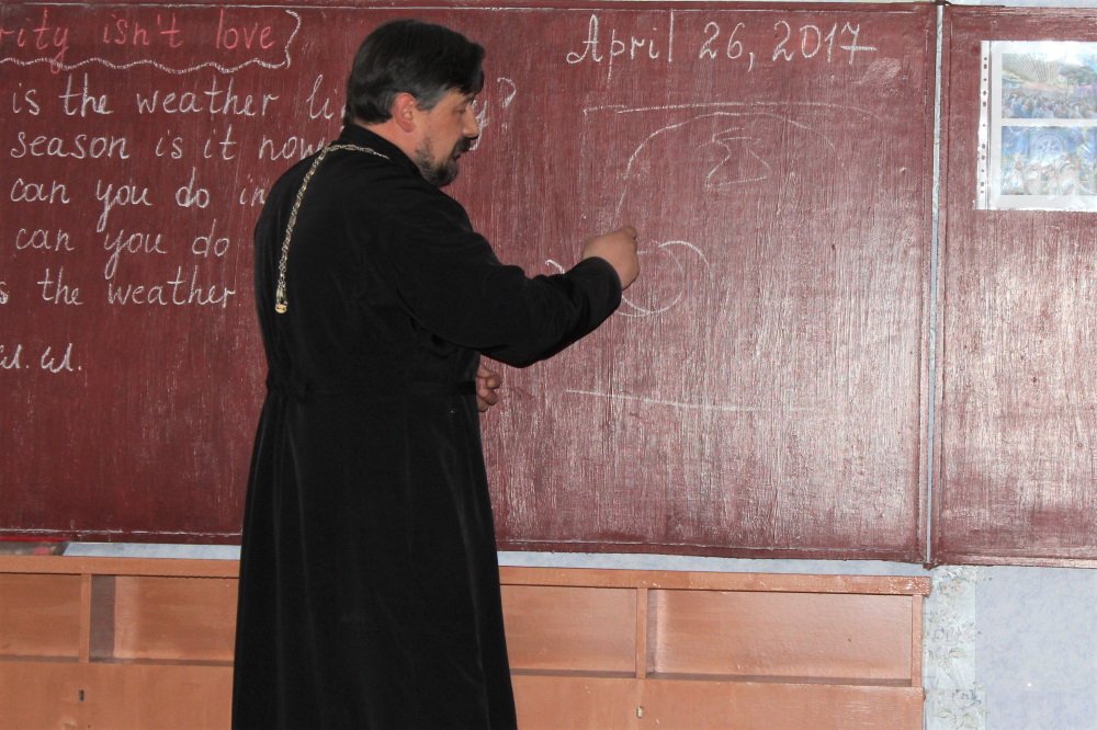 26 апреля протоиерей Николай Степанов, настоятель прихода храма Святого Архангела Михаила агрогородка Тихиничи, встретился с учащимися 11 класса средней школы №6 г. Рогачёва. Беседа была посвящена самому главному и самому таинственному христианскому празднику - Пасхе Христовой. В простых и доступных молодым людям образах отец Николай объяснил, что произошло с человеком в результате грехопадения и для чего понадобились крестные страдания Спасителя нашего Господа Иисуса Христа: " Вирус греха со времён Адама присутствует в каждом человеке. Посмотрите один день на себя со стороны. Вы заметите, сколько нечистоты в наших мыслях и словах. Причём, умом я понимаю, что надо по-другому, но всё равно делаю, потому что душа больна. Но мы творение Божье, и Он не стоит в стороне. Господь приходит к нам и воплощается, принимает на себя нашу природу и восстанавливает её в Себе. Не в нас, а в Самом Себе. Отныне наша задача заключается в том, чтобы крепко за Него держаться верой, как не умеющий плавать держится за спасательный круг. Почему такой способ спасения – через Крест? Бог есть Любовь, а любовь – это дарение себя, когда человек забывает о себе. Бог, умирая на Кресте ради любви к нам, связует Небо и землю, побеждает смерть. Теперь смерть – это не тупик, это дверь между временным и вечным. И мы должны позаботиться о том, что возьмём в эту вечность». Ребята задумались над услышанным, задавали вопросы, обсуждали. Совсем скоро они перешагнут порог взрослой жизни. Важно, чтобы именно сейчас они задумались над тем, что в бушующем море жизни Господь предлагает нам свою Церковь как корабль, на борту которого мы можем его переплыть.