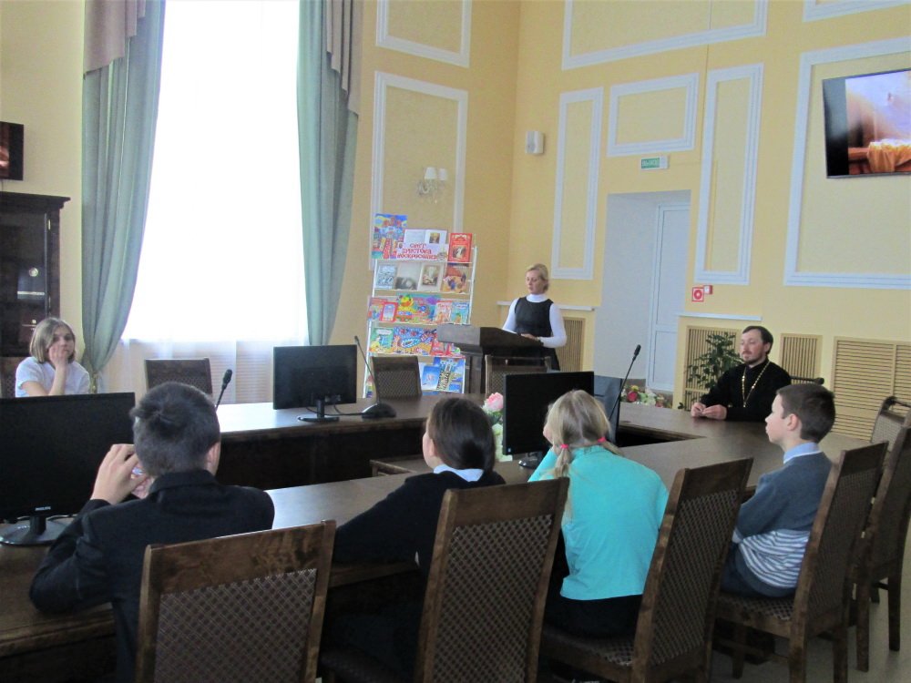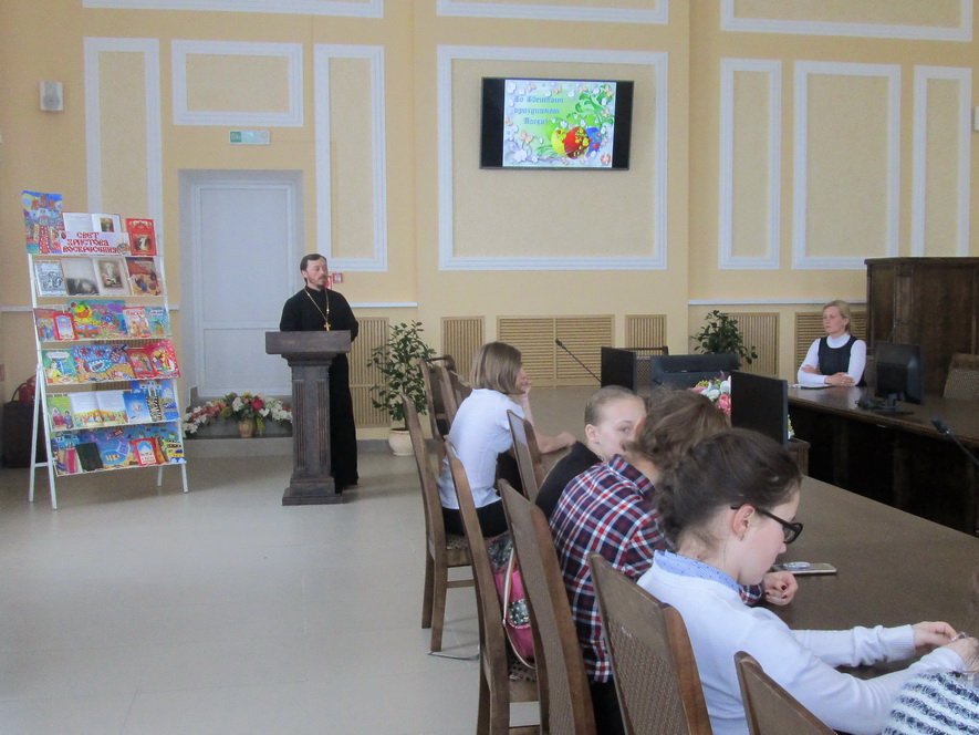 27 апреля в детском отделе Рогачевского Дома книги прошёл день знакомства с традициями «Пасхальная радость», в котором принял участие иерей Георгий Орловский, настоятель прихода храма Покрова Пресвятой Богородицы в агрогородке Довск. Встреча была посвящена самому светлому весеннему празднику - Пасхе. Мероприятие включало в себя литературную страничку, где библиотекарь Дорошкова Н.Н. познакомила присутствующих с замечательными произведениями С.Аксакова «Детские годы Багрова-внука», И.Шмелёва «Лето Господне». Прозвучали стихи К.Феофанова «Под напев молитв пасхальных», И.Бунина «Христос Воскрес». Учащиеся 7 класса средней школы №2 имени В.М.Колесникова познакомились с изданиями, представленными на выставке «Светлое Христово Воскресение», и презентацией об истории праздника. Отец Георгий продолжил разговор и познакомил ребят с традициями и символами праздника, а также ответил на их вопросы.