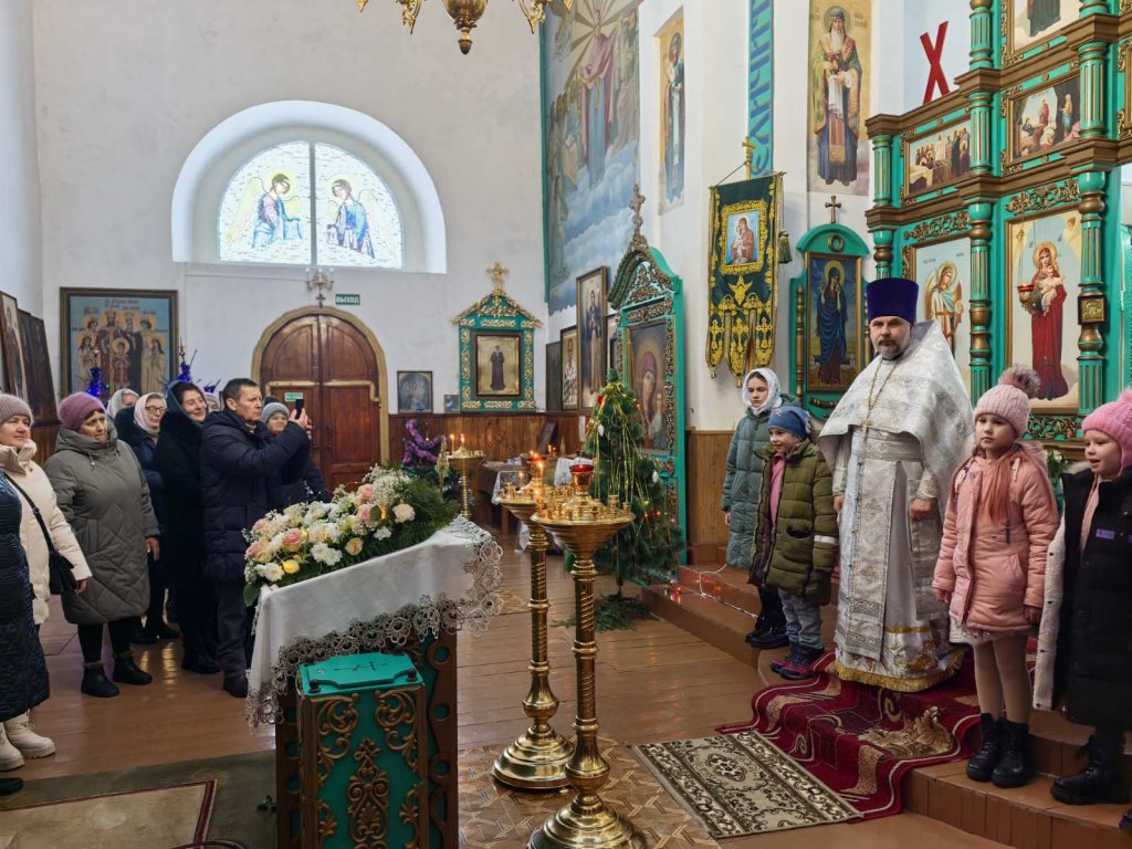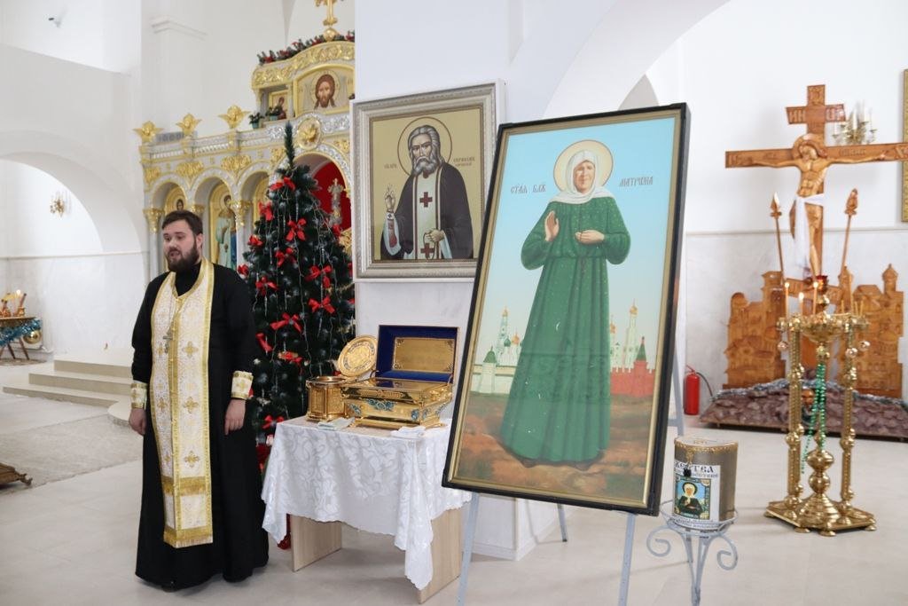Священник рассказал о праздниках Рождества Христова и Крещения Господня, а также о святых, в честь которых освящены приделы храма. Особое внимание в его рассказе было уделено великим православным святыням, временно пребывающим в храме: ковчегу с частицей мощей блаженной Матроны Московской и частице Ризы Пресвятой Богородицы.