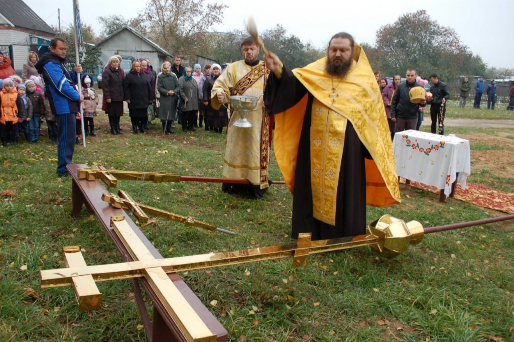 (обновлено) Освящение и установка купольных крестов в храме Святителя Николая Чудотворца городского поселка Корма В г.п. Корма в четверг, 22 октября 2015 года, состоялись освящение и установка крестов на здание строящегося нового храма в честь Святителя Николая Чудотворца. По благословению Преосвященного Стефана, епископа Гомельского и Жлобинского чин освящения возглавил архимандрит Амвросий, благочинный монастырей Гомельской епархии. Ему сослужили протоиерей Алексий Смотрицкий, благочинный церквей Рогачевского округа, настоятели храмов Свт.Николая Чудотворца в г.п.Корма иерей Виталий Лехнович и Покрова Пресвятой Богородицы в поселке Довск иерей Георгий Орловский. После молебна в храме и чина освящения архимандрит Амвросий обратился с проповедью к собравшимся людям, поблагодарил всех кто вложил силы, средства и свою любовь в это важное дело строительства храма. Затем к крестам приложились прихожане храма. По людям было видно, насколько долгожданным и волнительным было это событие. Такие моменты сплачивают приходскую общину, воодушевляют на молитву и новые труды. Особенно интересно было за всеми действиями священников и строителей наблюдать самым маленьким прихожанам- воспитанникам детского сада, ведь именно им в будущем наполнять новый храм жизнью и своими молитвами. Подрастая, посещая храм или даже просто по дороге в школу, которая находится рядом с ним, дети будут видеть золотые купола и кресты и осознавать, что они когда-то принимали участие в их освящении и установке. Сначала был установлен купол на колокольню, а затем на верхушки куполов воодрузили кресты. Здание храма стало одним из самых высоких в городском поселке Корма. По завершению отделочных работ храм несомненно станет украшением местности. В этом уверена и Татьяна Валентиновна Шехтер, председатель Кормянского районного Совета депутатов, которая от лица администрации района высказала признательность священнослужителям за молитвенную поддержку и проведенное мероприятие.