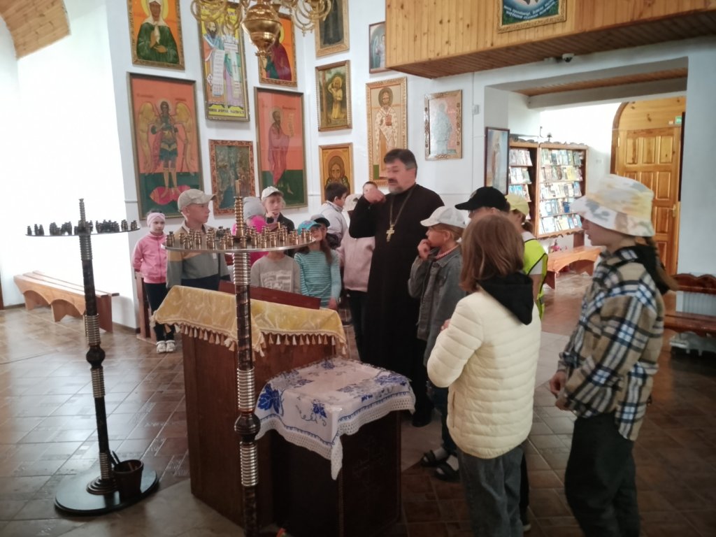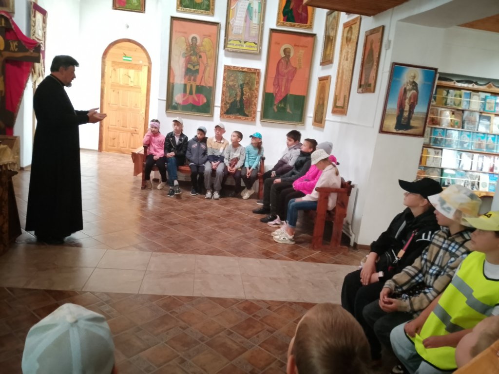 В ходе встречи священник рассказал ребятам из летнего школьного лагеря о Спасителе мира, Господе Иисусе Христе, о сути православной веры. Также настоятель прихода познакомил детей с устройством храма и правилом поведения в нём.