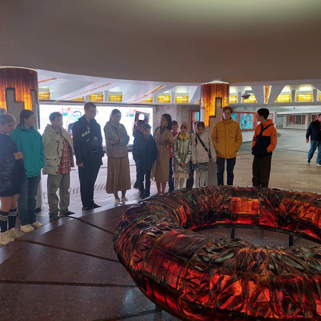 Следующим значимым пунктом стала Площадь Победы. Здесь экскурсанты почтили память погибших в Великой Отечественной войне у подножия 38-метрового обелиска и Вечного огня, увидели тумбы с землёй из городов-героев, а в подземном переходе — бронзовые плиты с именами 566 Героев Советского Союза. Венок Славы, литое стекло и строки на стенах вызвали глубокие чувства и размышления о подвиге и цене мира.