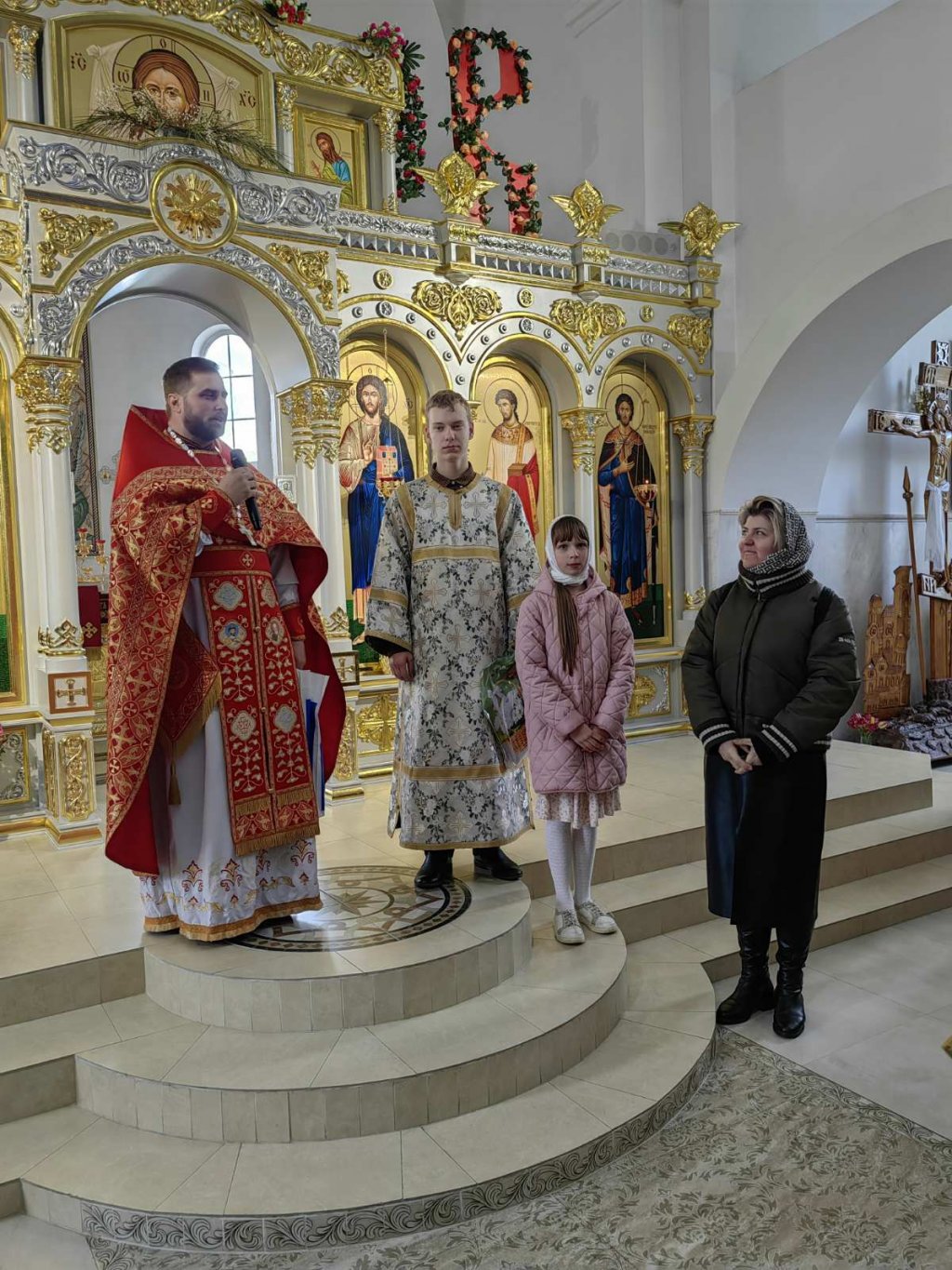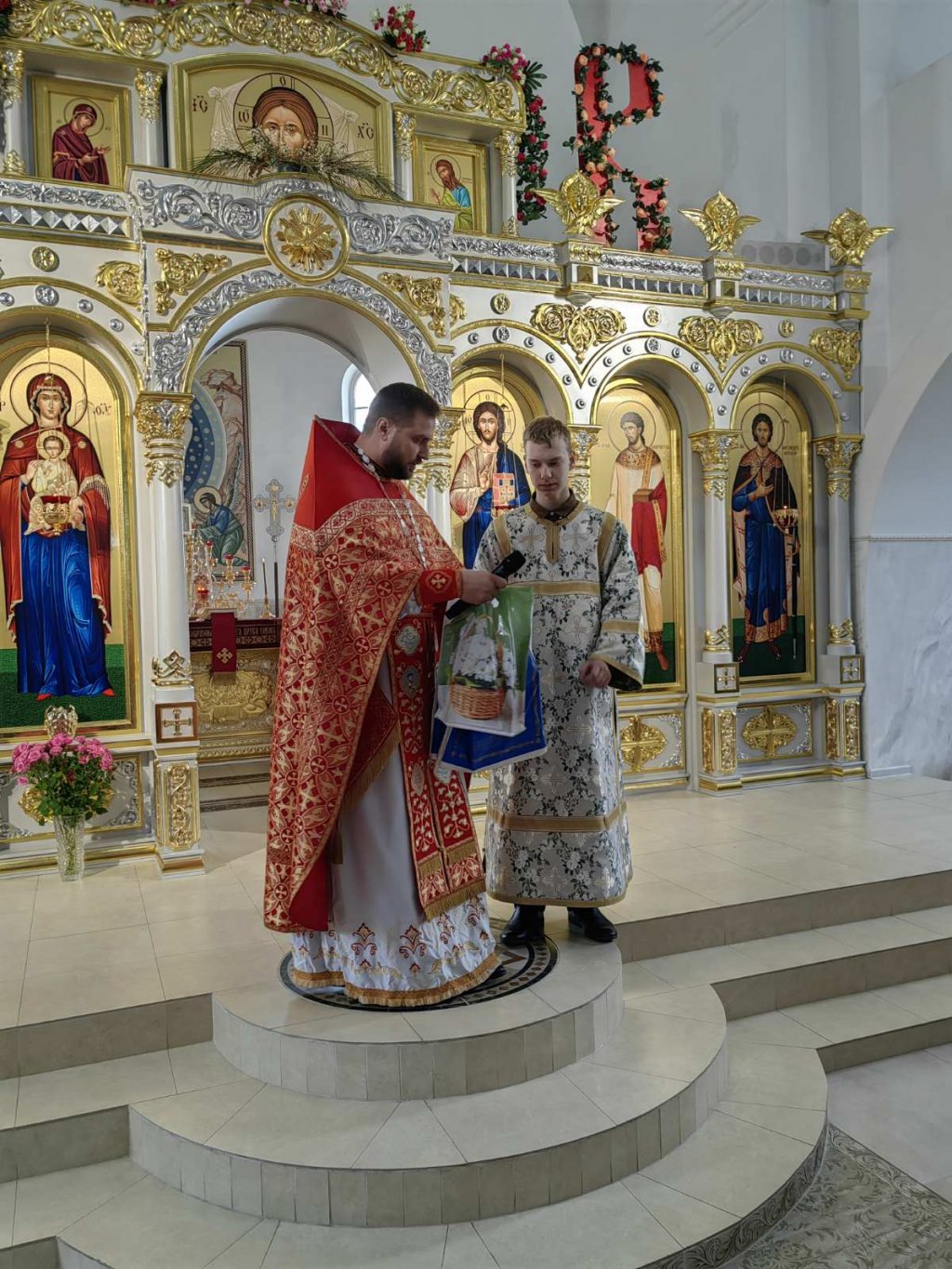 После Божественной литургии настоятель прихода храма святого благоверного князя Александра Невского в г.Рогачёве иерей Алексей Сергеев поздравил талантливых и старательных ребят: художников Исаева Ивана и Храменкову Марию, любителей чтения - Прокутиных Даниила и Викторию, Храменкову Анну. Вручил им подарки.