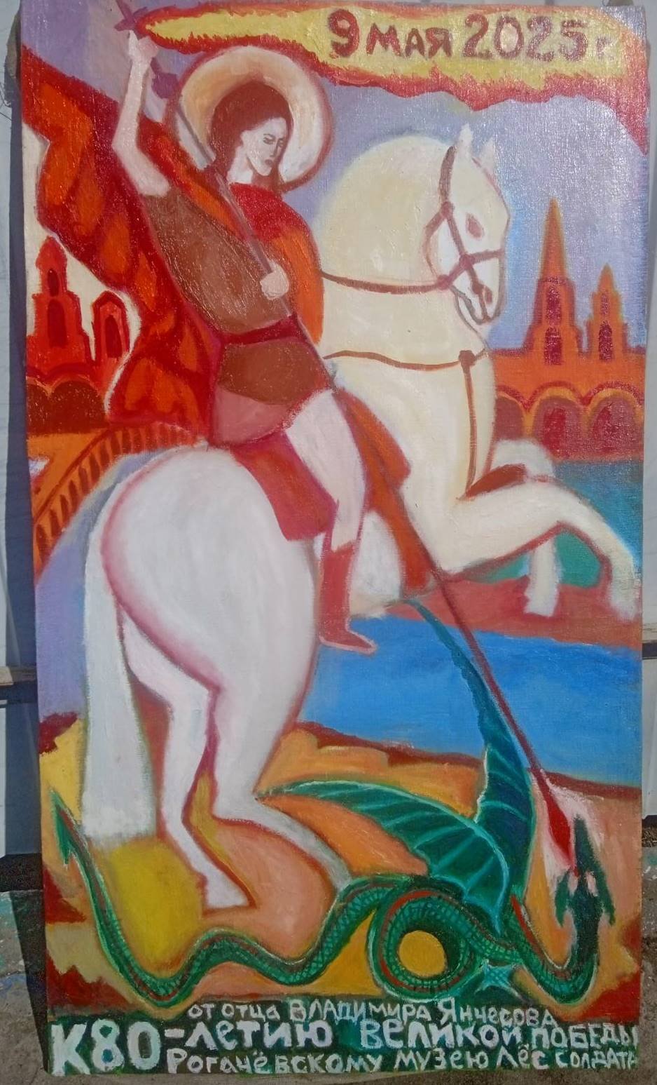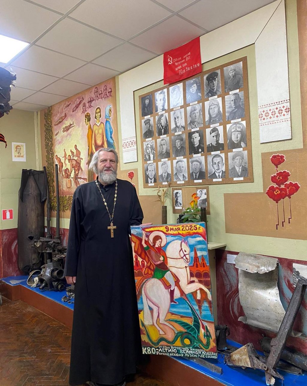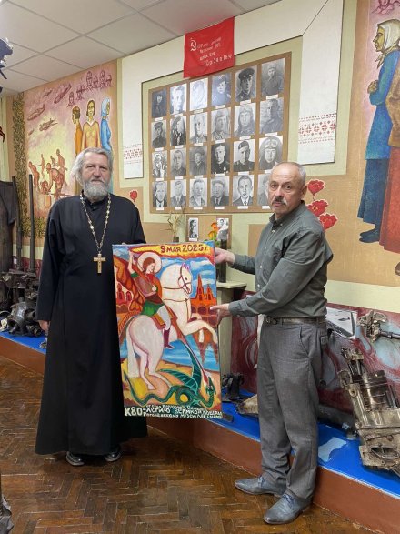 К 80-летию Великой Победы протоиерей Владимир Янчесов, настоятель прихода храма Святого Духа в аг.Дворец, вручил руководителю Рогачевского музея "Лёс солдата" Титовичу Геннадию Васильевичу образ вмч. Георгия Победоносца. Его изображение на серебряном коне основано на предании и символизирует победу над диаволом – «древним змием».