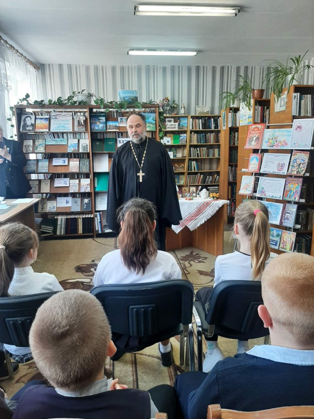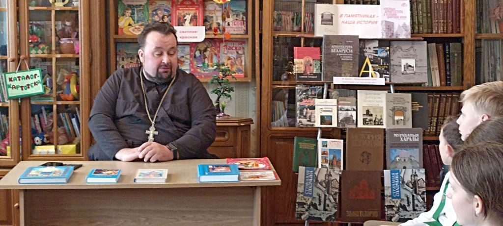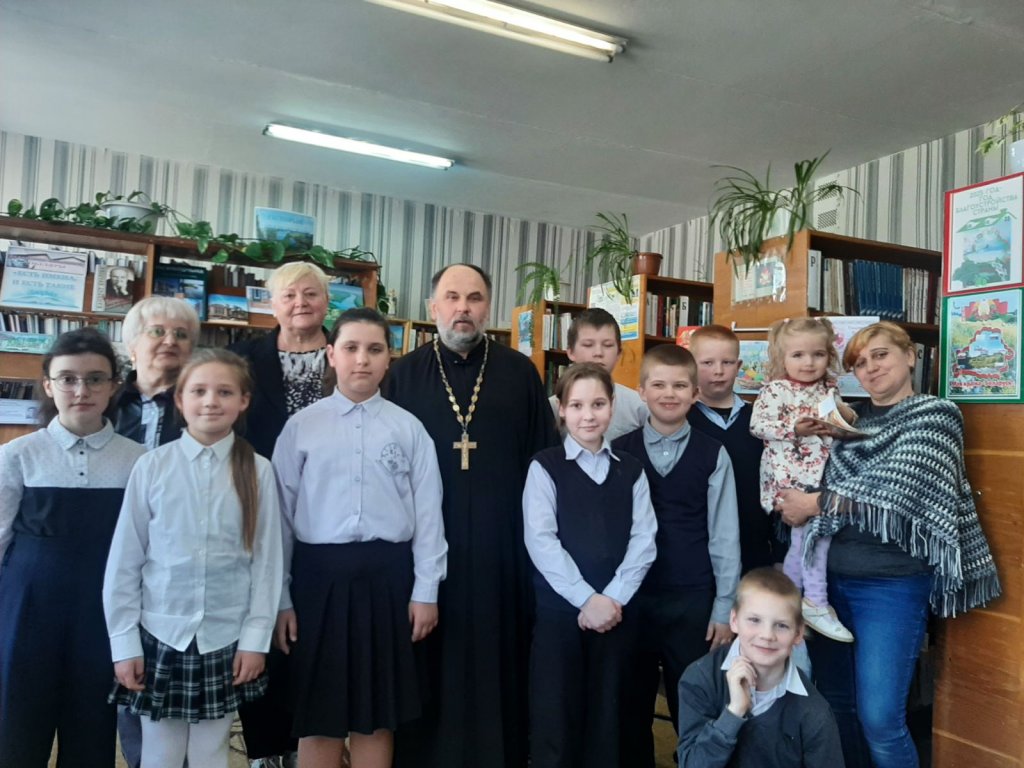 Накануне Светлой Пасхи в Довской сельской библиотеке прошла встреча настоятеля прихода храма Покрова Пресвятой Богородицы в аг.Довск протоиерея Виталия Левчука с учащимися 4 класса местной школы.