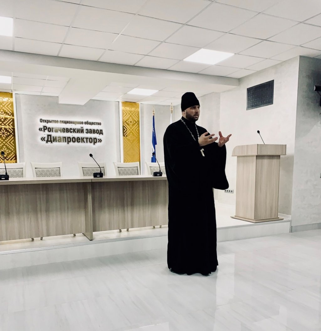 В ОАО "Рогачевский завод" Диапроектор" состоялась встреча коллектива предприятия с благочинным церквей Рогачевского округа иереем Алексеем Сергеевым. Работники завода с искренним интересом и вниманием слушали речь священника о значении семейных, духовных и нравственных ценностей в жизни каждого человека.
