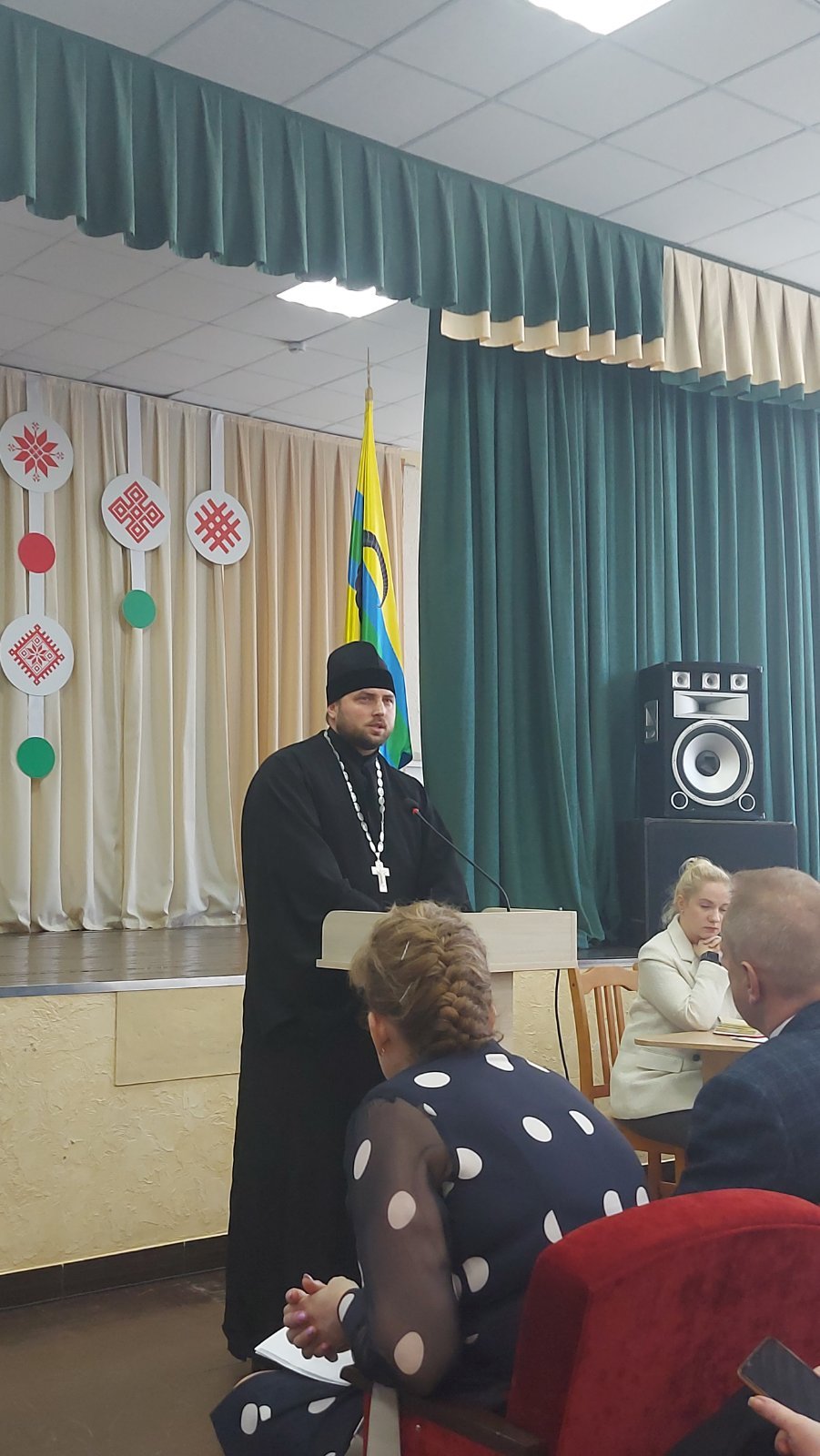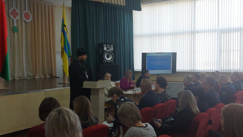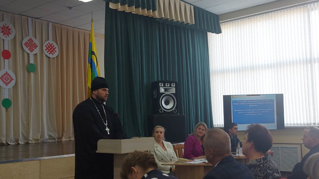 С докладом «О духовно – нравственном воспитании подрастающего поколения и семейных ценностях общества» выступил перед собравшимися благочинный церквей Рогачевского округа иерей Алексей Сергеев.