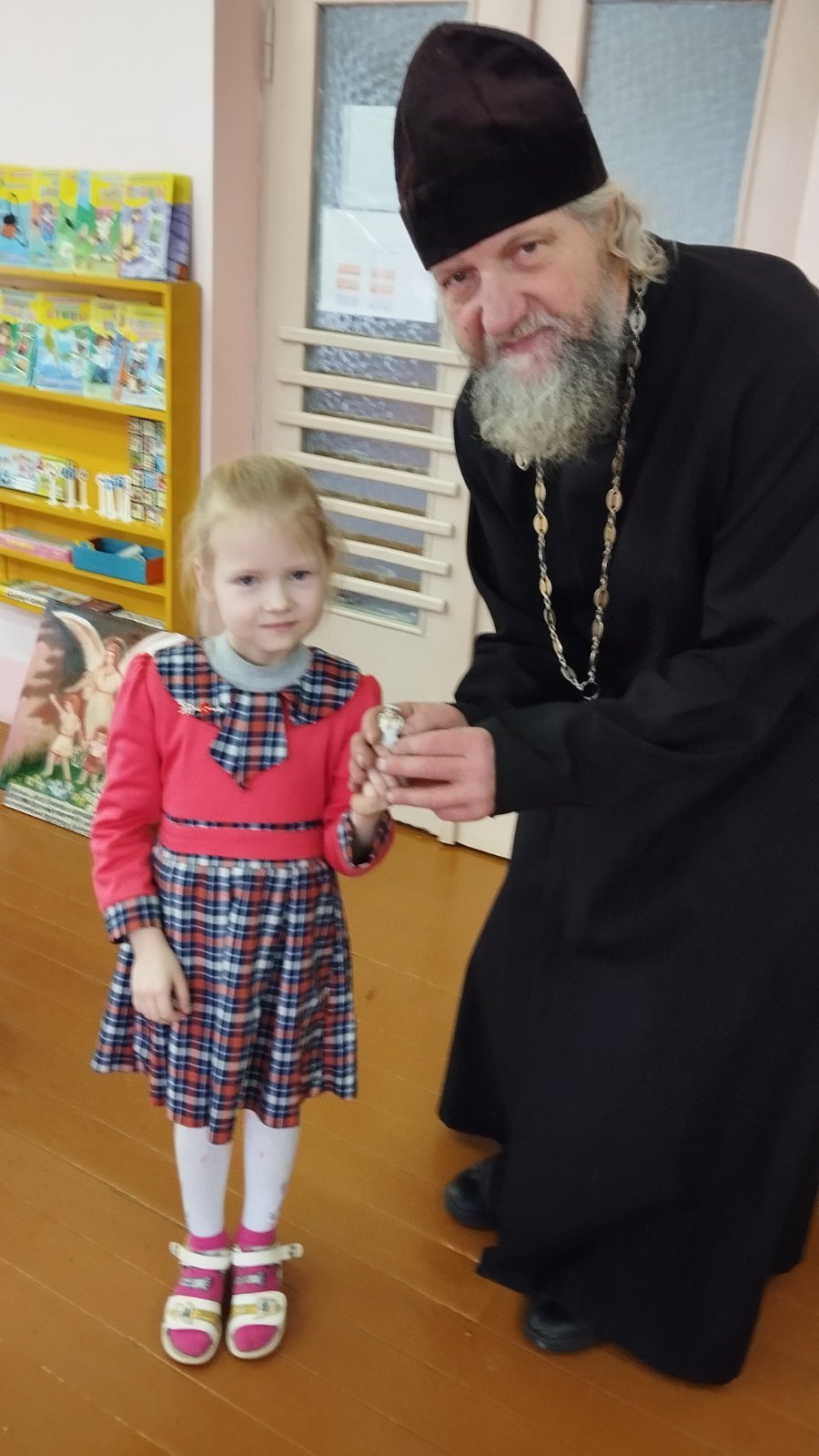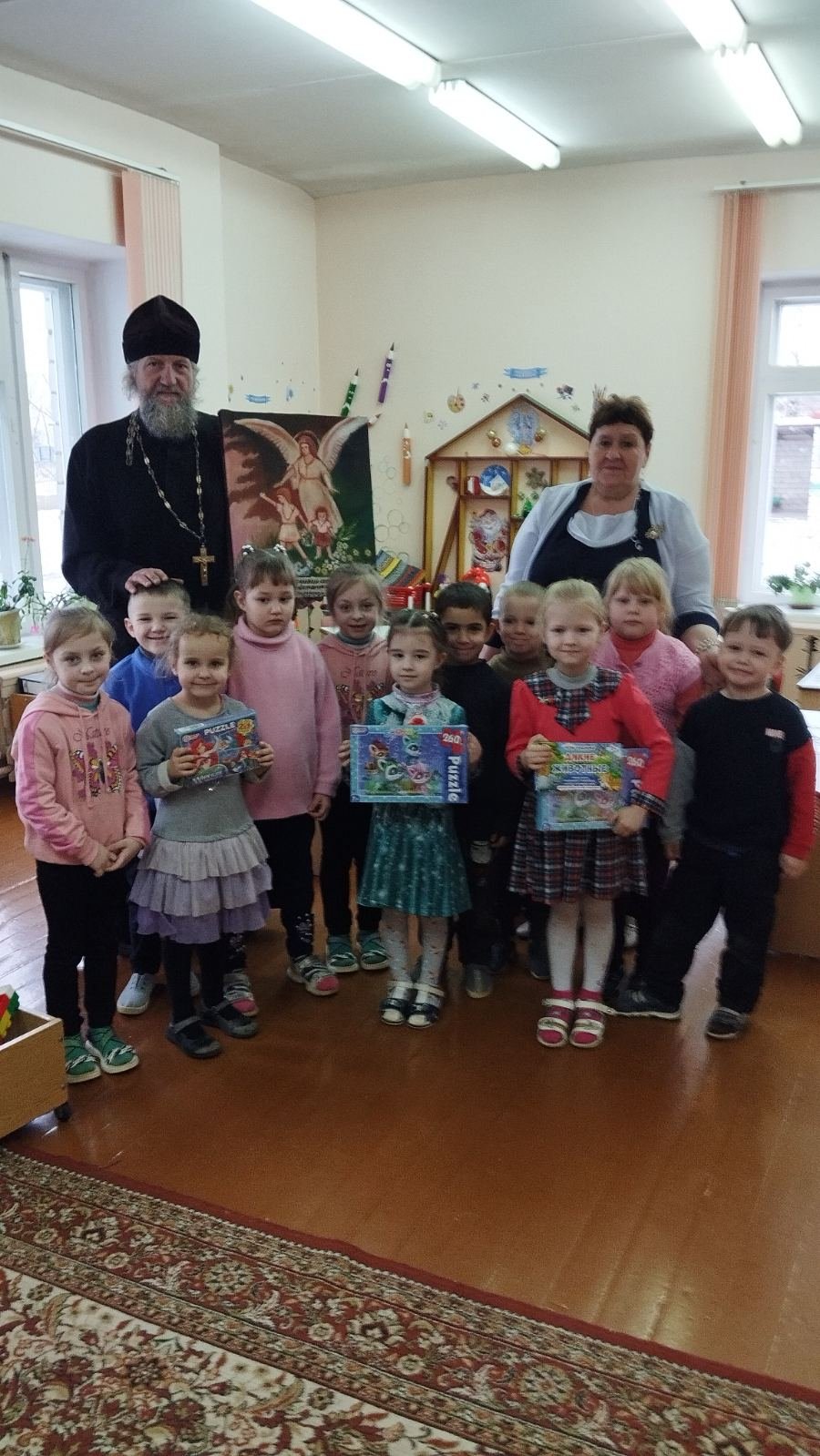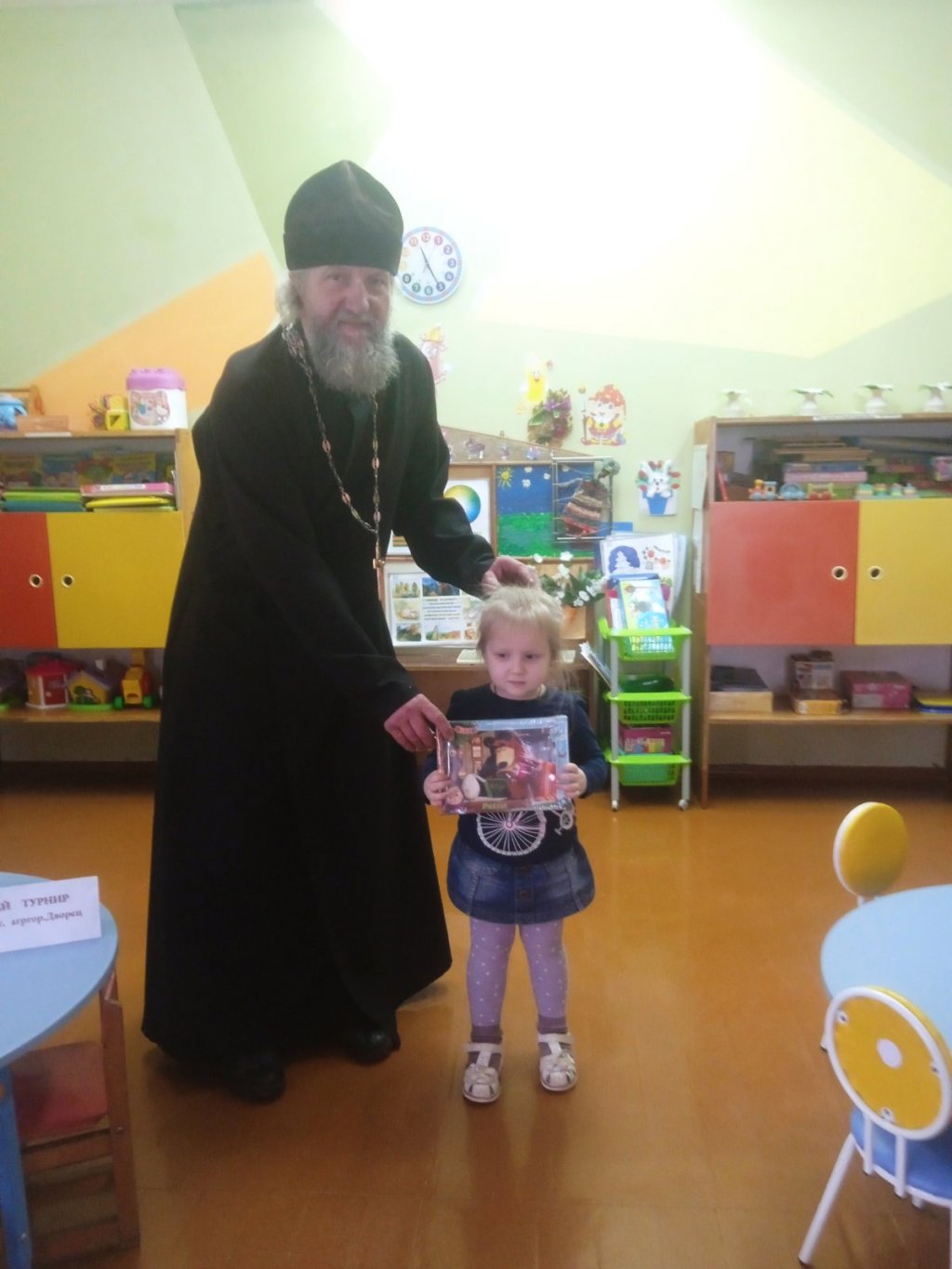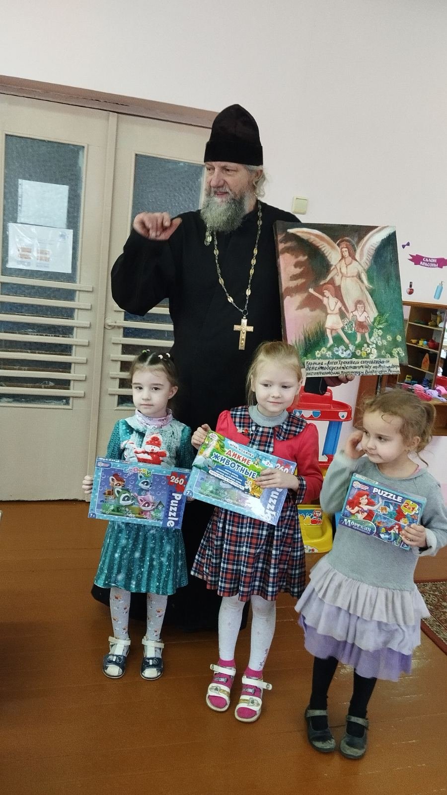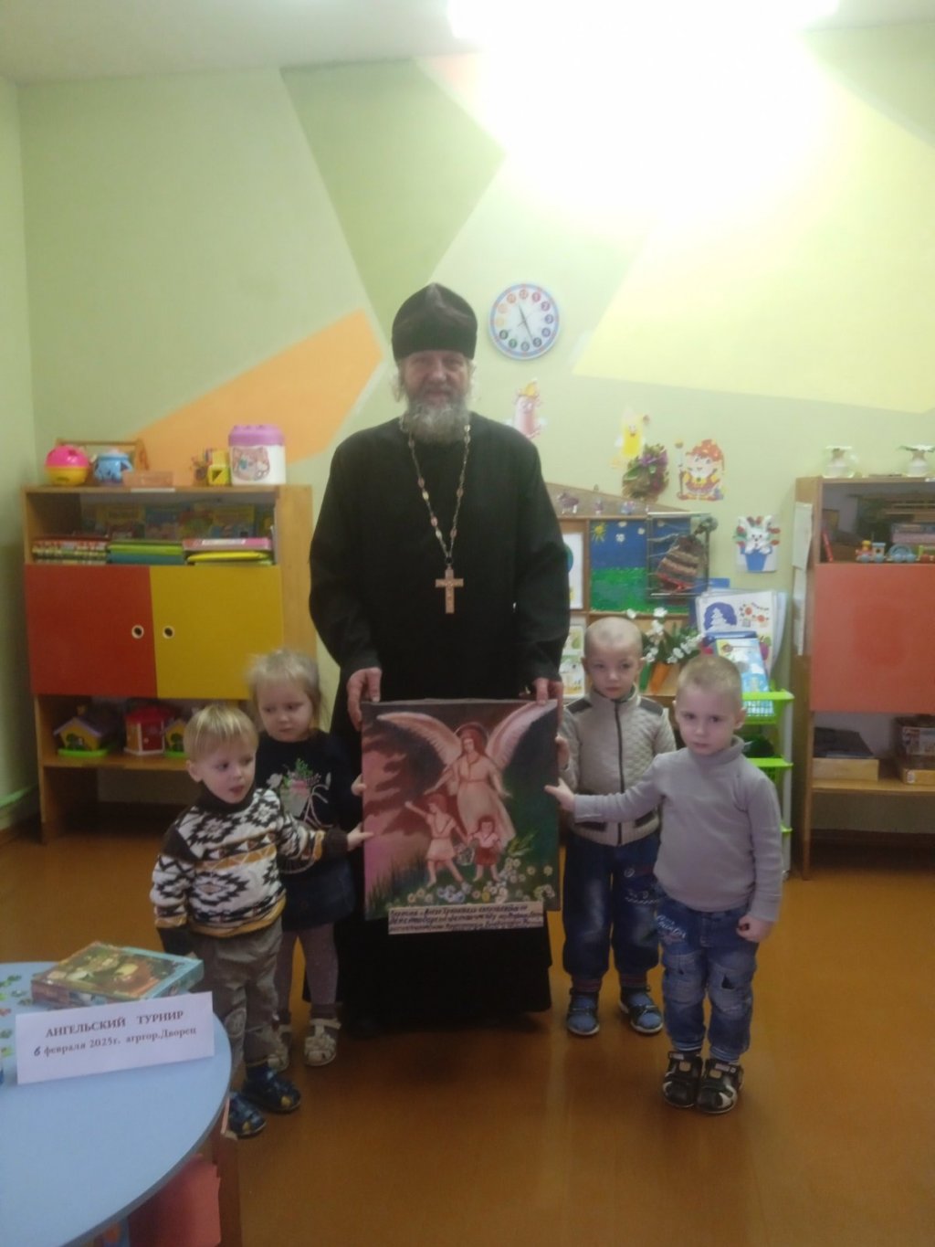 В старшей и младшей группе священник провел мероприятие «Моё святое имя». Каждый ребёнок узнал о святом, имя которого носит. Батюшка рассказал также о том, что при крещении каждому человеку Богом дается Ангел-хранитель, который оберегает его. Специально для этой встречи с детьми протоиерей Владимир Янчесов написал свою картину "Ангел - Хранитель сопровождает детей".