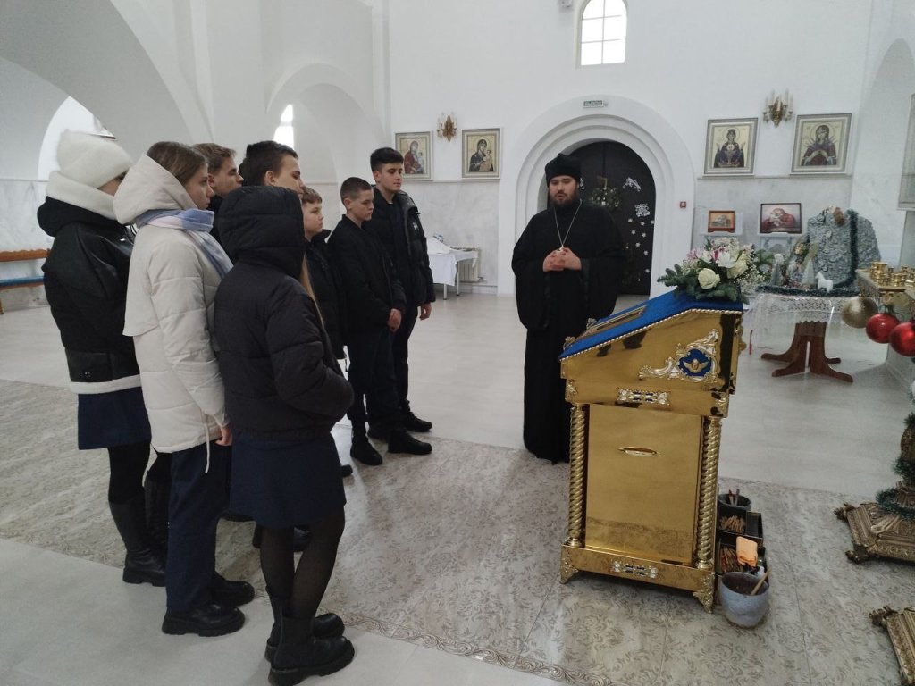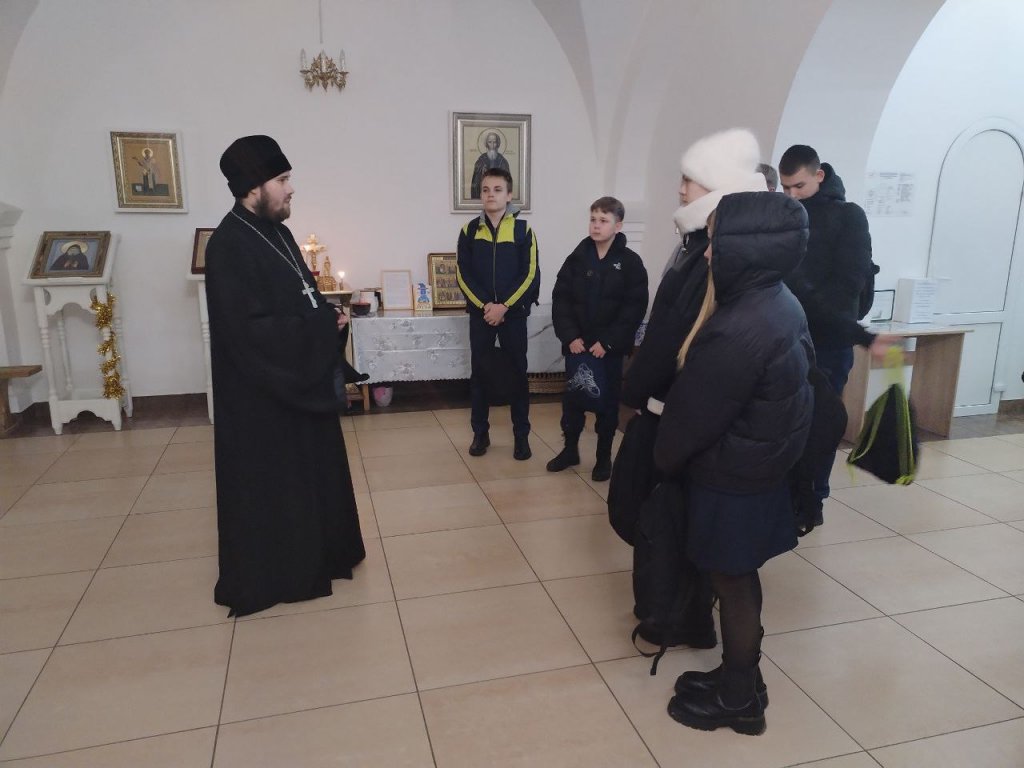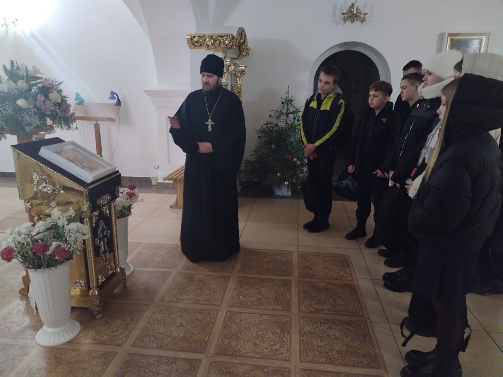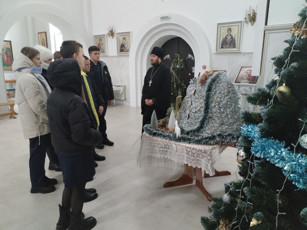 Гостей встретил и провел для них экскурсию клирик прихода храма иерей Александр Ткаченко. Священник рассказал о праздниках Рождества Христова и Крещении Господнем; о том, в честь каких святых освящены пределы храма.