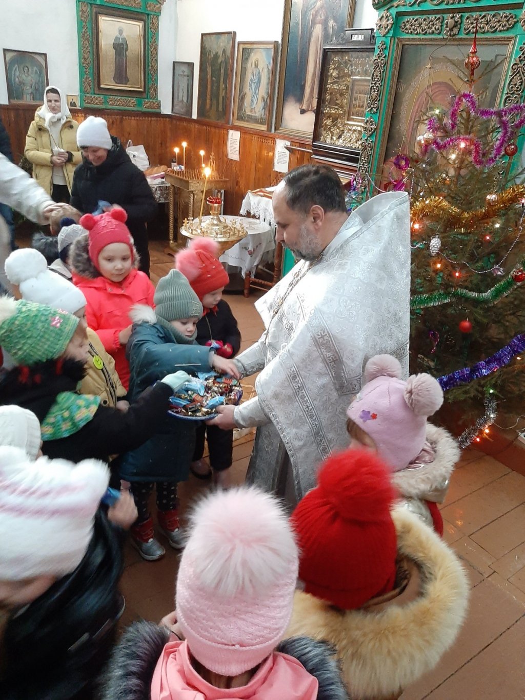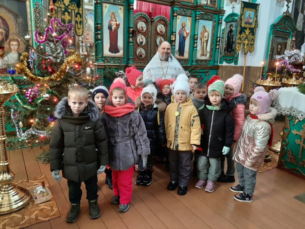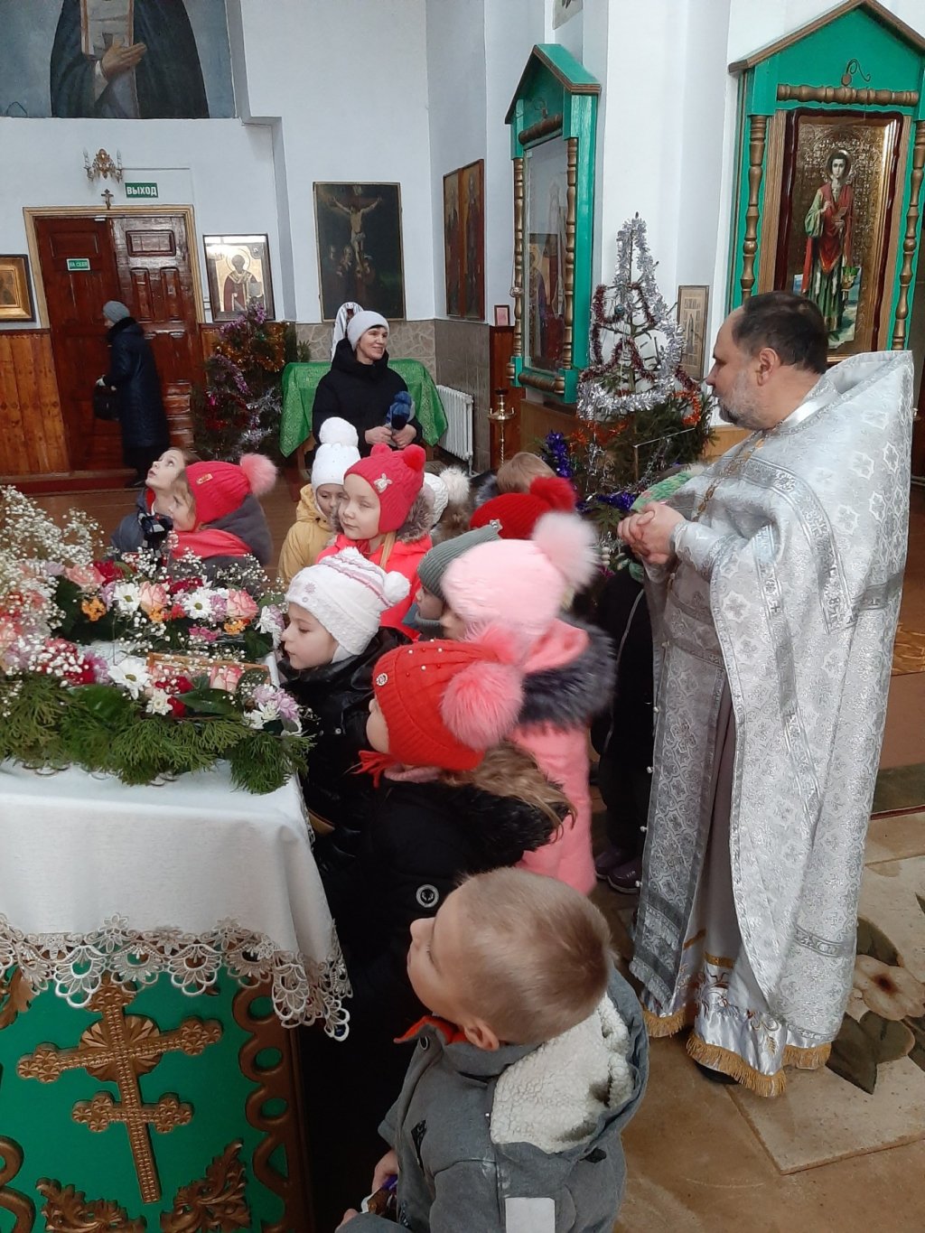 Дети подготовились, разучили с воспитателями рождественские стихи и поздравили прихожан со святыми днями. Настоятель храма протоиерей Виталий Левчук угостил ребят сладостями, рассказал, как нужно себя вести в храме, и познакомил с его устройством, с иконой Рождества Христова.