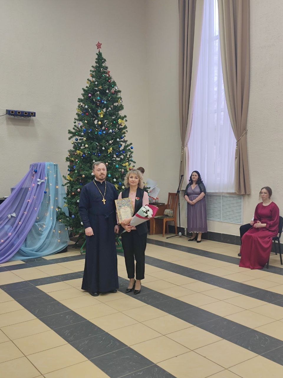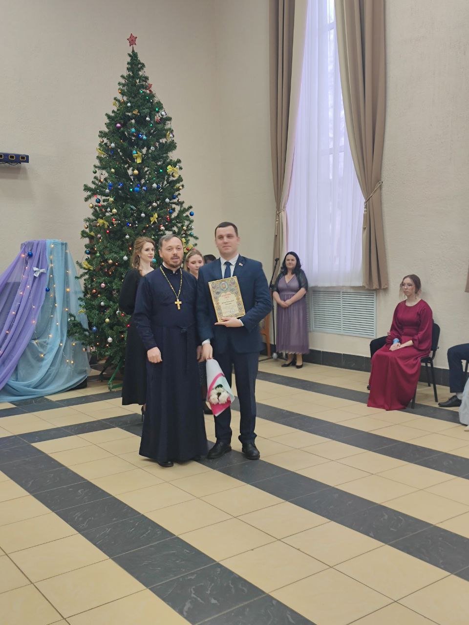 Отец Георгий поздравил всех присутствующих с Рождеством Христовым и вручил Благодарственные грамоты Дмитрию Шинкаренко, председателю Кормянского райисполкома, за содействие и помощь в строительстве церковно-приходской школы и Наталье Суворовой, заведующему детским садом № 6, за многолетнее сотрудничество с приходом храма и духовно-нравственное просвещение подрастающего поколения.