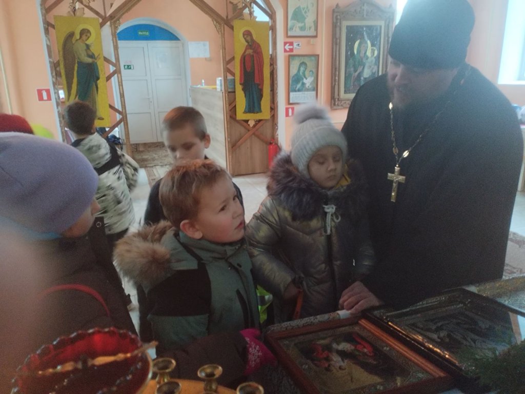 В церкви, украшенной к Рождеству Христову, священник рассказал детям о том, что Бог родился не в царских палатах, не в богатой семье. Он рождается беспомощным ребёнком в семье плотника, трудится и заботится о родных. Став человеком, Он принял на Себя все, свойственное людям, кроме греха.