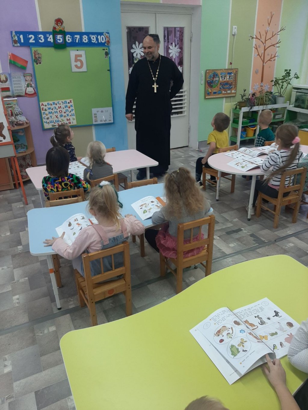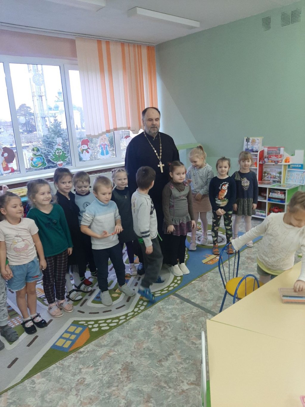 Накануне праздника святителя Николая Чудотворца протоиерей Виталий Левчук, настоятель прихода храма Покрова Пресвятой Богородицы в аг.Довске, посетил местный детский сад и поздравил ребят и воспитателей с наступающим праздником угодника Божия.