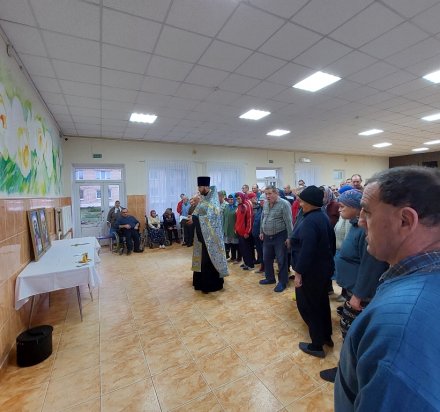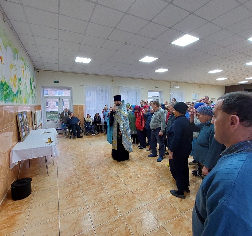 Священник совершил молебен о здравии, поздравил подопечных и сотрудников пансионата с наступающим праздником Введения во Храм Пресвятой Владычицы нашей Богородицы и Приснодевы Марии и передал от прихожан храма сладкие подарки.
