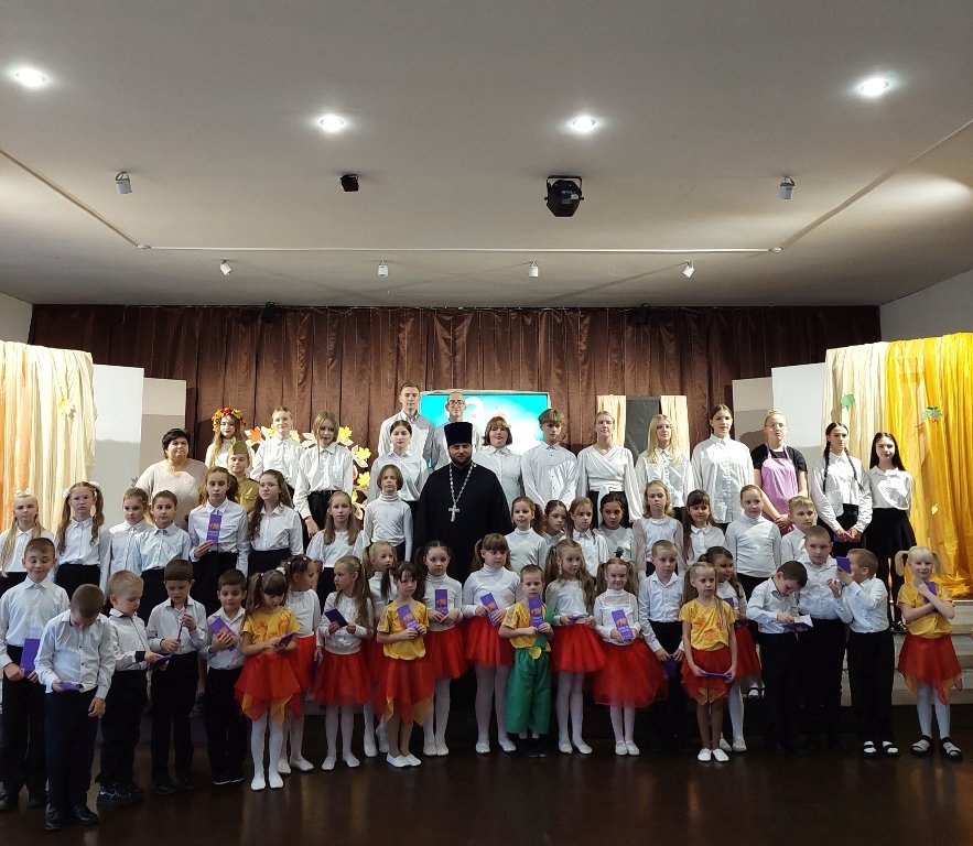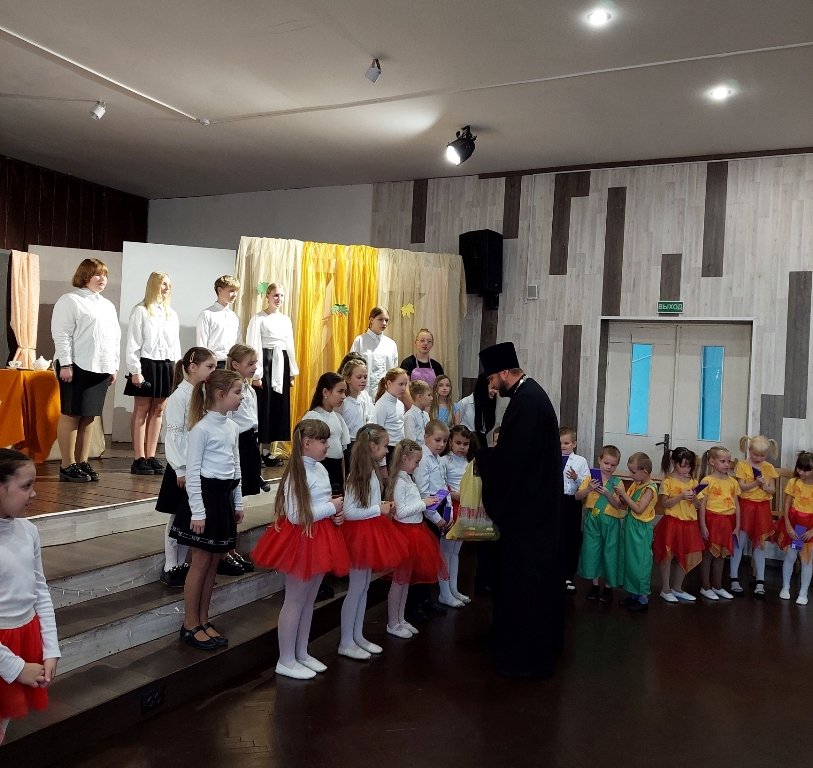 Иерей Алексей Сергеев поблагодарил юных артистов, которые со сцены знакомят с православными праздниками и делятся истинными жизненными ценностями, а также их талантливых педагогов: Никитину Наталью Евгеньевну и Контанистову Татьяну Валерьевну, музыкального руководителя – Язвинскую Марину Георгиевну.
