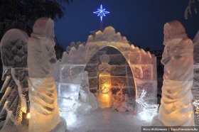 На Рождество по традиции братия вертеп сделала. Прямо у храма посреди зимнего сугроба – ледяная пещера, освещённая фонариками, в ней деревянные ясли, в яслях настоящее сено, рядом тряпичные лошадка с осликом и, самое главное, – Пресвятая Богородица с Младенцем Христом на полотне.