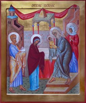 По закону Моисея, первенца мужского пола посвящали Богу. Старший сын должен был исполнять какие-либо работы для храма. Когда с течением времени потребность в таких работах исчезала, то, установился обычай приносить жертву как выкуп за первенца. Для бедных это была покупка двух голубей при храме, которых затем выпускали на волю. Только после очистительной молитвы в притворе храма мать могла посещать храм. Пресвятая Дева, Матерь Божия, не имела нужды в очищении, ибо неискусомужно родила Источник чистоты и святости, но по глубокому смирению Она подчинилась предписанию закона. В то время жил в Иерусалиме праведный старец Симеон. Ему было откровение, что он не умрет, пока не увидит Христа Спасителя. В храме была также 84-летняя вдовица Анна пророчица, дочь Фануилова , "которая не отходила от храма, постом и молитвой служа Богу день и ночь. И она в то время, подойдя, славила Господа и говорила о Нем (Богомладенце) всем, ожидавшим избавления в Иерусалиме" (Лк. 2, 37 - 38). До Рождества Христова вся Ветхозаветная Церковь, все праведные мужи и жены жили верой в Грядущего Мессию-Спасителя мира и ожидали Его пришествия. Слово "сретение" значит встреча, потому, что последние праведники уходящего Ветхого Завета - праведный Симеон и Анна пророчица удостоились встретить в храме Носителя Нового Завета, в Лице Которого уже встретились Божество и человечество. Если обратим внимание на Икону праздника, то нам в красках и линиях откроется богословский смысл этого события: Дева Мария с Младенцем на руках в сопровождении праведного Иосифа идет в Иерусалим. Матерь Божия, святостью Своей превосходящая Серафимов, Нерукотворный храм Божий, повинуясь закону, идет в Иерусалимский храм, чтобы принять обряд очищения. Та, перед которой склоняются ангелы, склоняет голову Свою под благословение священника. Мария и Иосиф приносят искупительную жертву за Того, Кто присутствием Своим освящает храм и Святая Святых, кто станет Жертвой за грехи всего мира. Как царь, переодевшись нищим, осматривает свои владения, так Владыка храма в образе сорокадневного Младенца, входит в Свой Дом. Эту тайну знают только ангелы и двое святых - Симеон и Анна. Также посвящен в эту тайну первосвященник (старший священник чреды) Захария, отец Иоанна Предтечи. Старец Иосиф держит в своих руках клетку с двумя горлицами - жертву за Иисуса, которых затем выпустили на волю. Этот жест, который повторялся иудеями из века в век только теперь обрел подлинный смыл Христос, Своей Крестной жертвой освободит души людей из темницы ада, даст им свободу и Свой вечный небесный покой. Но остановимся подробнее на фигуре блаженного старца. Праведный Симеон происходил из священнического рода. В молодости он участвовал в переводе Библии на греческий язык (это тот перевод, который известен нам как перевод «Септуагинта» или перевод семидесяти толкователей, которые, по повелению Птолемея Филадельфа, сделали его для знаменитой Александрийской библиотеки) Святой Симеон во время перевода книги пророка Исаии решил вместо слов: "Дева родит Сына" написать: "молодая женщина родит сына", но был остановлен ангелом, который возвестил ему, что тот не умрет, пока не увидит воочию исполнение этого пророчества. Прошли годы и десятилетия. Старец прожил более трех столетий, но смерть как будто забыла о нем. Жители Иерусалима рассказыва