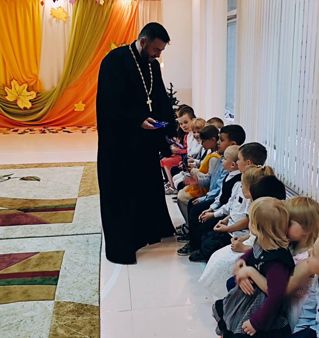 Иерей Игорь Ковальчук поздравил воспитанников, родителей и весь коллектив учреждения образования с Покровом Пресвятой Богородицы, поблагодарил за прекрасное представление ребят и педагогов, вручил детям сладкие подарки.