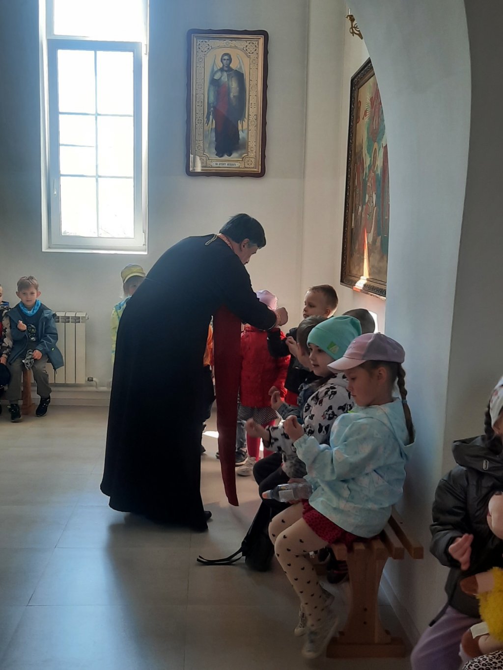 Священник рассказал детям, как нужно себя вести в доме Божием, показал икону нашего Спасителя, научил правильно креститься.