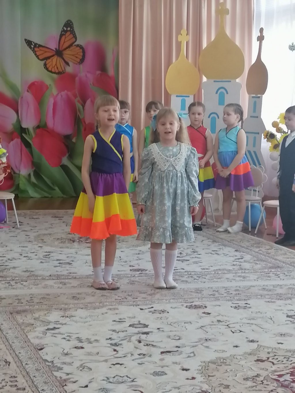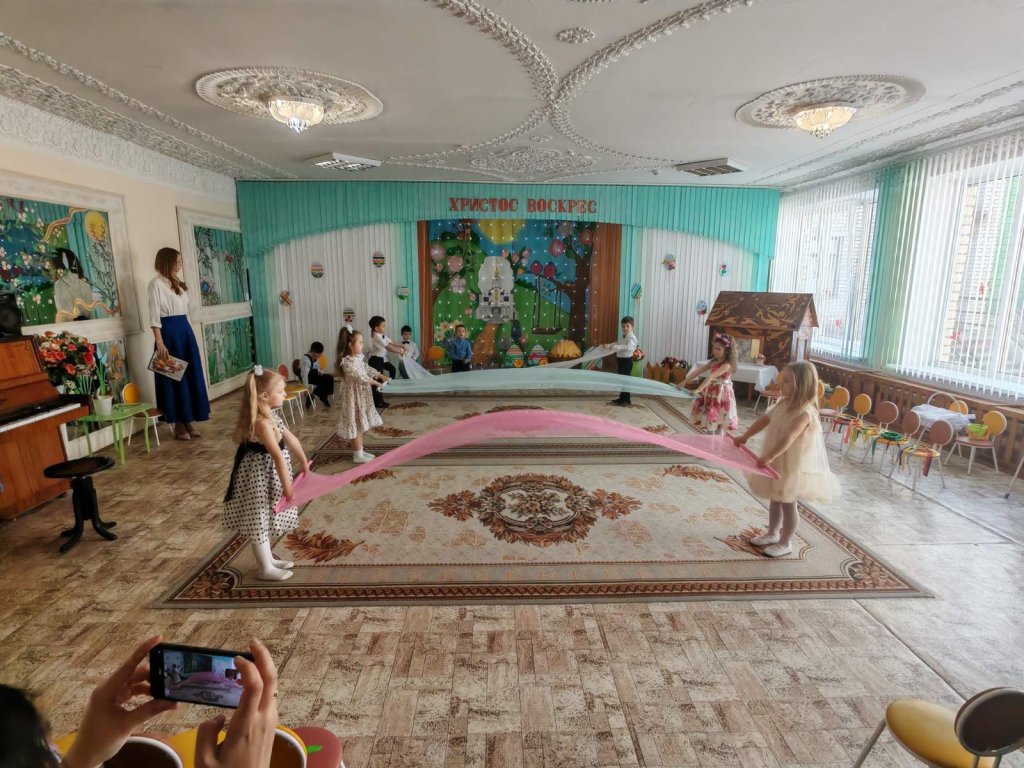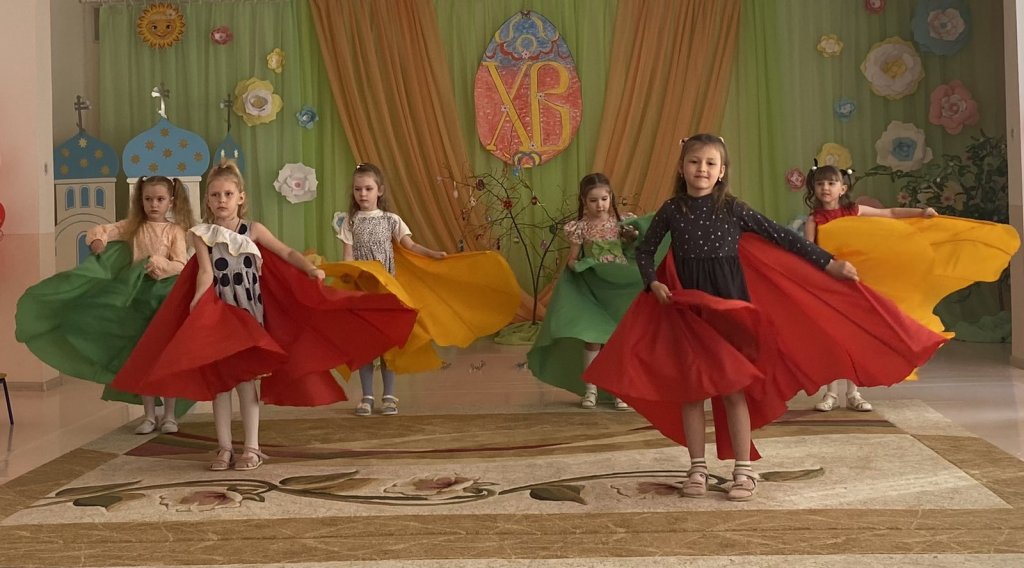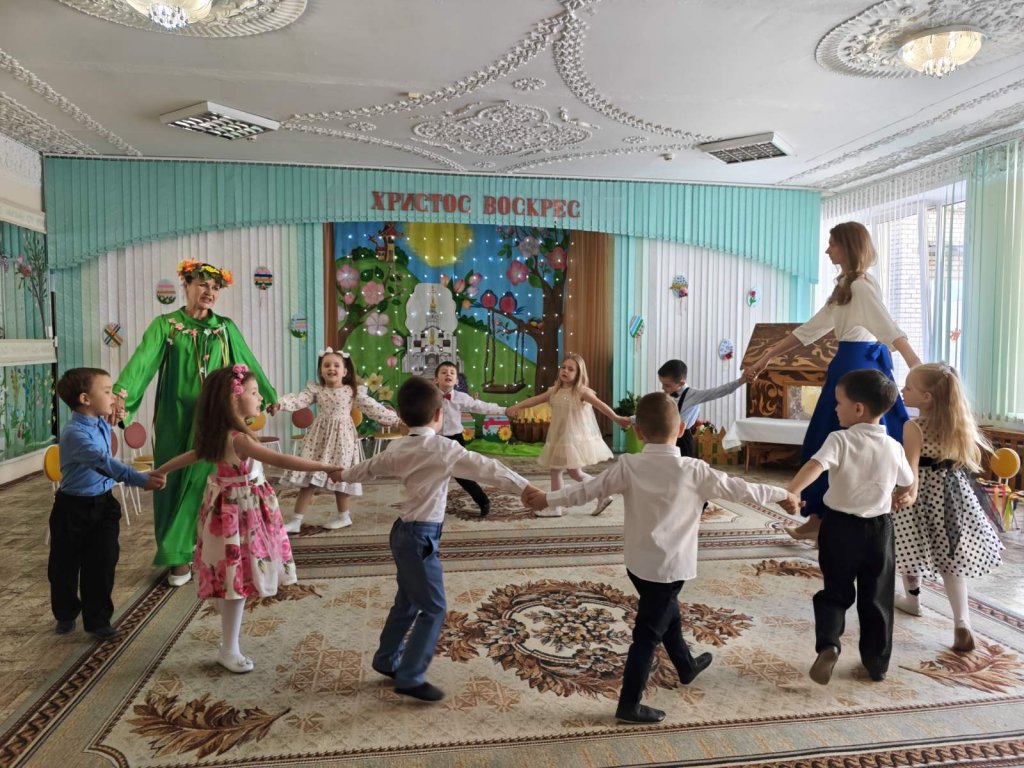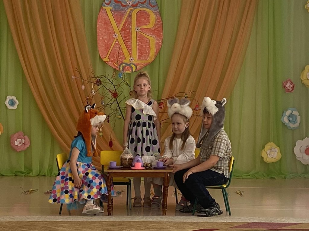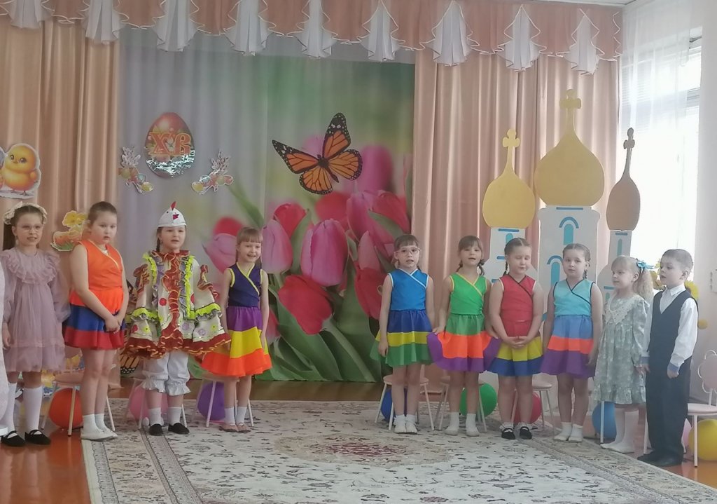 Музыкальный руководитель Ивантатова Елена Викторовна и воспитатель Журавлёва Татьяна Леонидовна подготовили с ребятами чудесное представление: театральную постановку, пасхальные песни и стихи, танцевальный номер в ярких, нарядных костюмах.