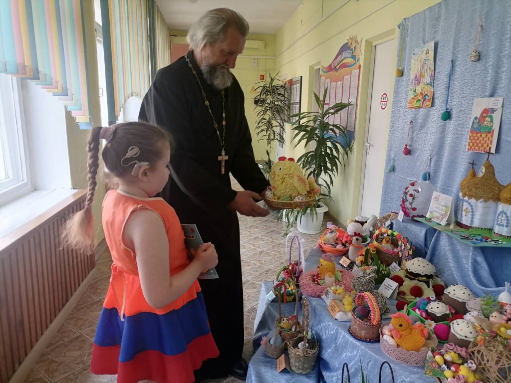 Дети порадовали батюшку выставкой пасхальных поделок и рисунков – совместным творчеством с родителями и воспитателями.