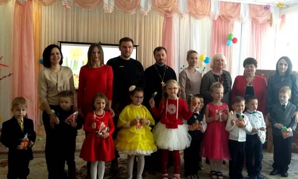 А в яслях-саду № 12 г.Рогачева воспитанники старшей группы собирали «Пасхальный букет» из весенних хороводов, песен и игр. Ведь вся Земля, которую создал Бог, и венец Его творения - человек - радуются Воскресению Христову. И разносится пасхальная весть во все уголки: "Христос Воскресе!" В гости к ребятам заглянула Весна, чтобы рассказать о весенних православных праздниках: Входе Господнем в Иерусалим (Вербном воскресенье) и Благовещении. Благодарные дети решили сделать в подарок Богородице цветок, лепестками которого станут любовь, вера, надежда и другие добродетели. Пришла на праздник и Курочка с цыплятами. Она познакомила ребят с традицией украшения пасхальных яиц и даже сыграла с ними в игру "Катись, катись, яичко". Дети играли так задорно, что присоединиться к ним решили родители: вместе веселей. Всеобщую радость разделил протоиерей Алексей Смотрицкий, настоятель прихода храма Святого благоверного князя Александра Невского. Он поздравил всех со Светлым Христовым Воскресением и вручил ребятам пасхальные сувениры.