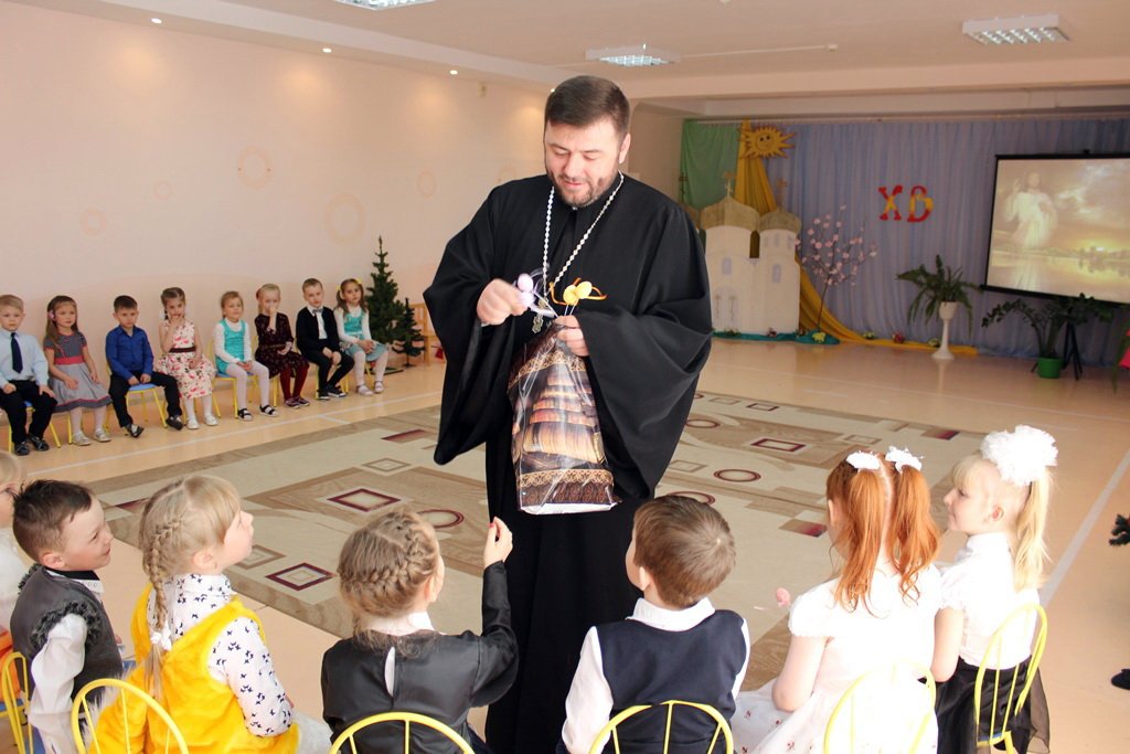 Только открылся 11-й Пасхальный фестиваль, а весть о Воскресении Христа уже дружно зазвучала в детских садах рогачёвщины. 10 апреля в Довском детском саду прошёл утренник «Пасхальная радость». Ребята рассказали историю праздника, прославляли воскресшего Христа в песнях и танцах, знакомились с народными традициями пасхальных игр. В гостях у дошколят побывал настоятель прихода храма Покрова Пресвятой Богородицы агрогородка Довск иерей Георгий Орловский. Он поздравил ребят и взрослых со светлым праздником Пасхи Христовой, отметил, с каким старанием дети готовились к этому дню, мастерили поделки для выставки пасхальных яиц. А ребята благодарили батюшку за добрые слова и сладкие подарки.