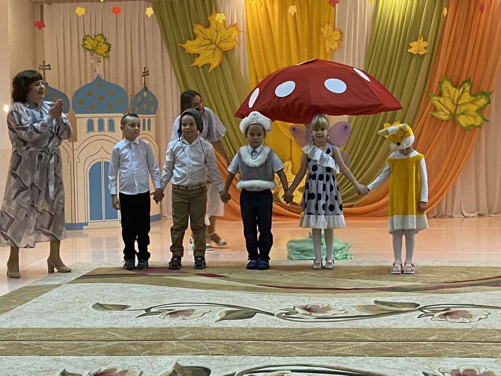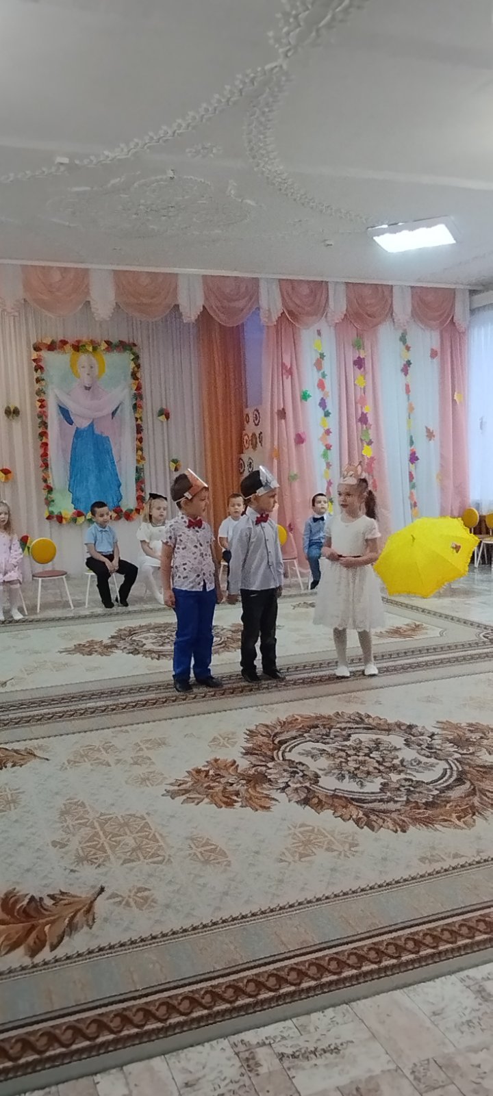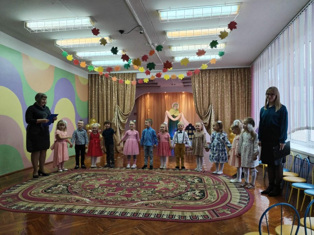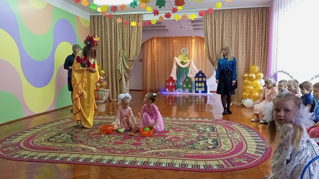 На утреннике воспитанники средней группы познакомились с историей праздника Покрова, а затем встречали хозяйку Осень, помогали ей собрать урожай, водили хороводы и дарили мамам подарки, сделанные своими руками.