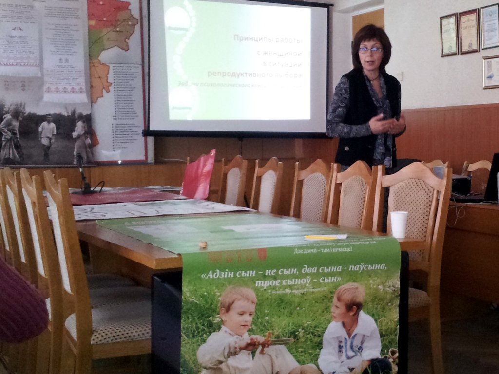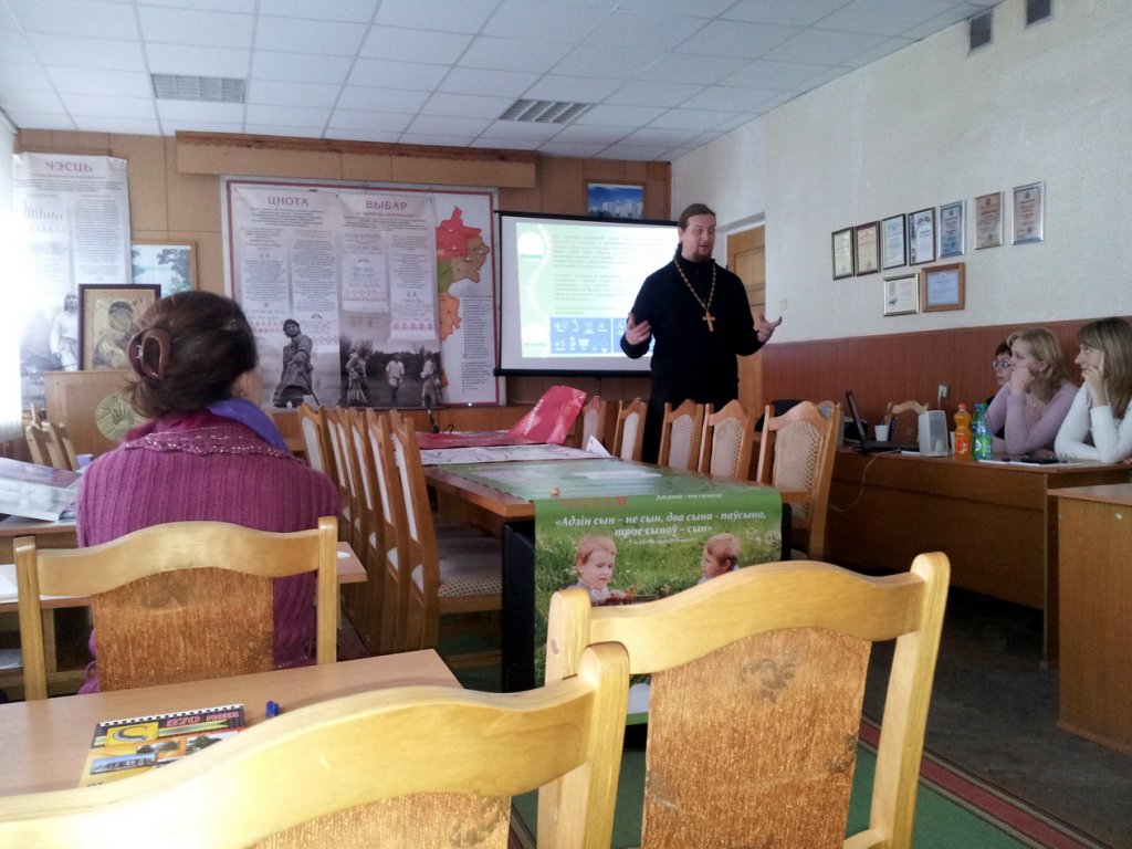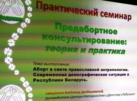 В городе Рогачеве, по благословению епископа Гомельского и Жлобинского Стефана, 14 ноября 2013 г. прошел практический семинар: «Предабортное консультирование: теория и практика». Организаторами семинара выступили: Центр Материнства и Детства «Ладушки» г. Гомель и сестричество милосердия им. прп. Евфросинии Полоцкой г. Рогачев. Открыл семинар приветственным словом благочинный Рогачевского благочиния протоиерей Алексий Смотрицкий. Помещение для встречи, замечательный конференц-зал, было любезно предоставлено Рогачевским районным исполнительным комитетом. Слушателями и активными участниками семинара выступили психологи сферы образования, сестры сестричества, зав.женской консультацией центральной районной больницы г. Рогачева. Работа семинара началась с доклада руководителя Центра «Ладушки» свящ. Владимира Дробышевского «Аборт в свете православной антропологии. Современная демографическая ситуация в Республике Беларусь». После выступили сотрудники Центра «Ладушки» психологи: Сосновская Татьяна Ивановна «Различные аспекты принятия решений об исходе беременности. Типы ситуаций» и Логунова Людмила Владимировна «Методические аспекты предабортного консультирования. Особенности и этапы построения беседы». Изначально семинар планировался только для сестер милосердия, которые вот уже 6 лет при женской консультации больницы беседуют с женщинами в ситуации репродуктивного выбора. Своею целью семинар стремился дать профессиональное видение ситуаций, их типологию и стратегию консультирования, тактику и методологию в общении с кризисными беременными. К огромной радости сотрудников Центра «Ладушки» живой интерес к намеченной встречи проявили и специалисты: психологи и врачи-гинекологи. Участникам встречи были продемонстрированы наглядные материалы: стенды и плакаты, модели эмбрионов в натуральную величину на разных сроках беременности, выставка на белорусском языке «Цнота». Доклады сопровождались видео роликами, подчас весьма непростыми. Центр «Ладушки» передал главной сестре сестричества врачу-педиатр Наталье Дерябиной, координатору семинара с принимающей стороны, модели эмбрионов на 10 недели беременности, которые можно использовать на предабортном консультировании, а все участники встречи получили брошюрки «Пустые песочницы» и разнообразные "пролайфовские" буклеты и листовки.