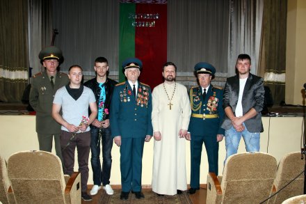 К 68 годовщине Великой Победы 07 мая в военкомате города проведена встреча призывников с ветеранами Великой Отечественной Войны. Ребята с интересом послушали рассказ о минувших боях, трудностях и радостях тех лихих лет. С наставлениями к будущим воинам обратился клирик храма святого благоверного князя Александра Невского в г. Рогачеве протоиерей Александр Атрощенко. В заключение отец Александр благословил ребят на ратный труд. Школьники поддержали призывников своими бравыми номерами.