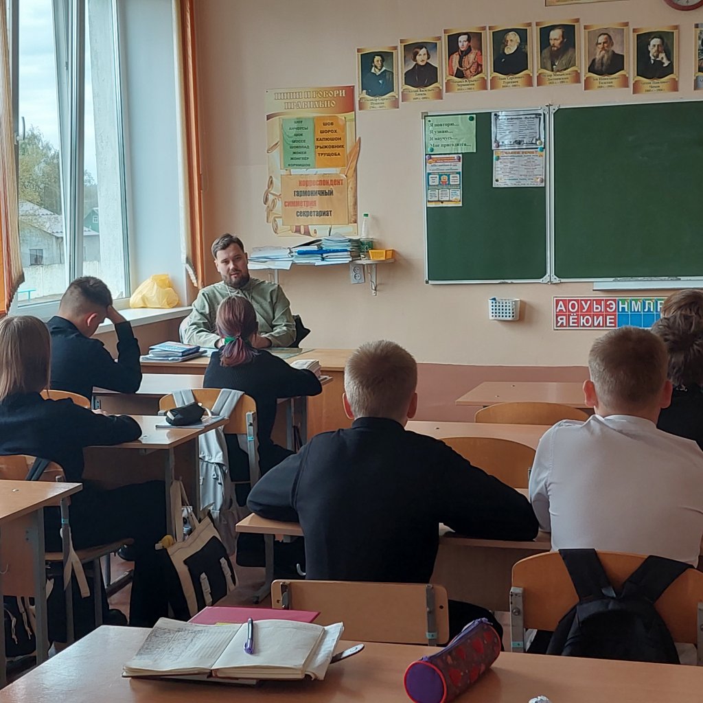 С учащимися 5–7 классов отец Виталий провёл духовную беседу, посвященную празднику Воздвижения Честного и Животворящего Креста Господня. Священник рассказал школьникам об истории обретения Креста, раскрыл его глубокий духовный смысл и объяснил, почему орудие позорной казни стало для христиан символом победы над смертью и грехом, источником радости и спасения.