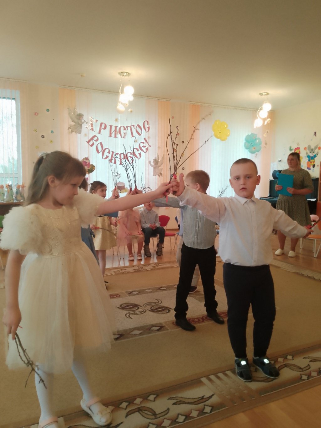Трогательно и искренне исполнялись песни и стихи, малыши кружились в весеннем танце с вербочкой в руках. А игра детей на цимбалах, погремушках и ложках удивила всех и подарила весёлую мелодию.