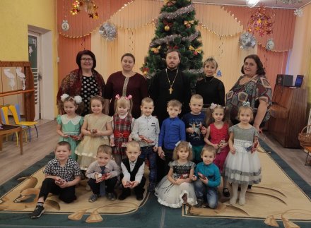 Увлекательное путешествие к рождественской ёлочке совершили 12 января воспитанники старшей группы яслей-сада №13 г.Рогачёва. В дороге они узнали о рождении Спасителя и поспешили принести Ему свои дары. Кружились в лёгком танце звёздочки, освещая пещеру, где родился Младенец Христос, и украсили чудесными огнями скромную ёлочку. Животные пришли поклониться Господу и согреть Его своим дыханием. Танцевали от радости снеговики. И даже пингвины в Антарктиде радовались рождению Спасителя. Протоиерей Георгий Мартышевский, клирик прихода храма святого благоверного князя Александра Невского, разделил с детьми и взрослыми радость Рождества Христова. Священник поблагодарил детей и педагогов за интересное представление, поздравил всех с праздником, пожелал сохранить в душе умение по-детски любить жизнь и согревать близких своим вниманием и заботой. Завершился праздник вручением подарков и общей фотографией.