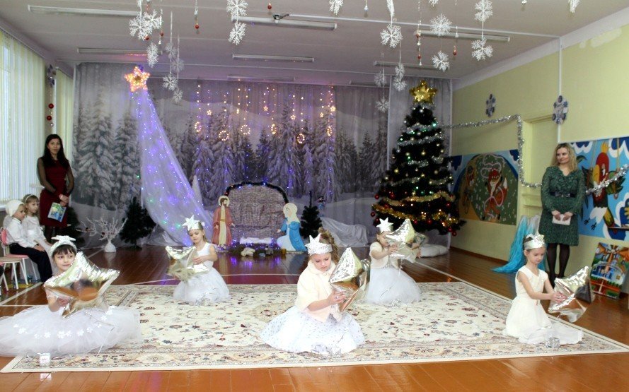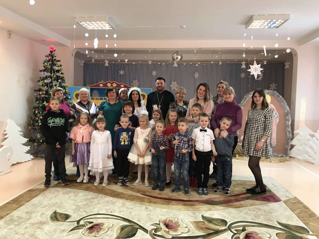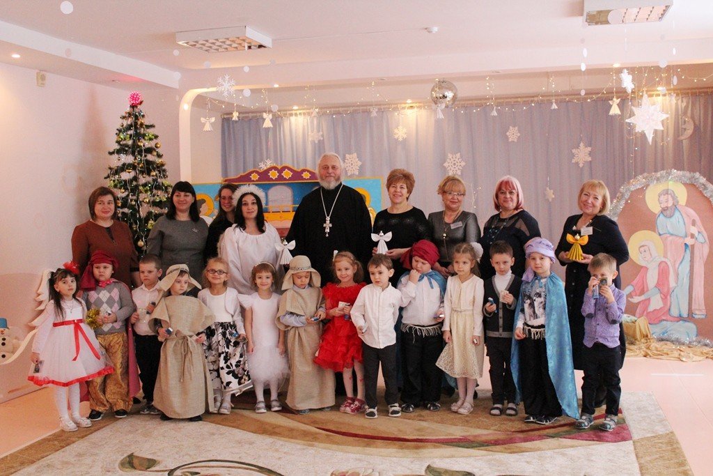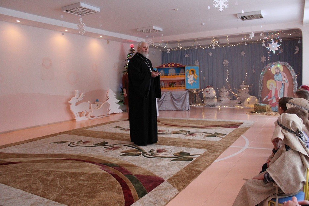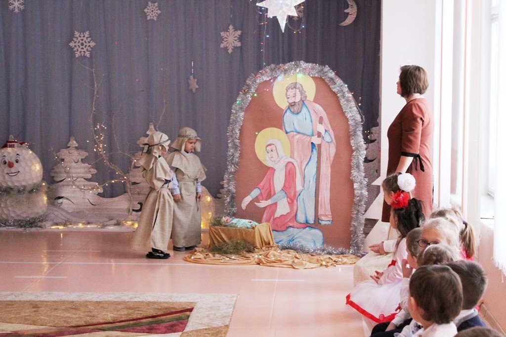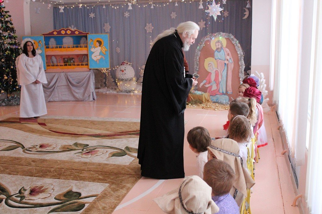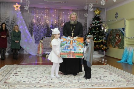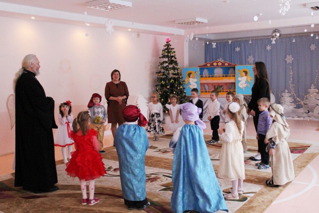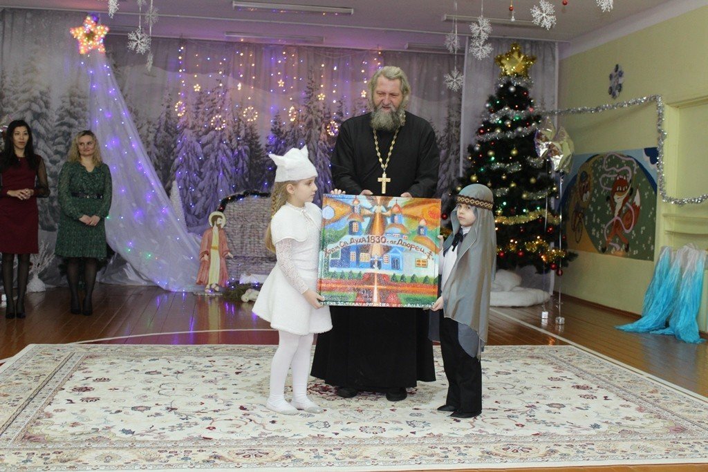 Праздничное представление «Дарит мгновения волшебства светлый праздник Рождества» в санаторном яслях-саду №4 г.Рогачева 11 ноября посетил настоятель прихода храма Святого Духа аг.Дворец протоиерей Владимир Янчесов. Трогательную рождественскую историю подготовили воспитанники старшей группы. Чарующий звон колокольчиков и рукотворная красота экспонатов выставки семейного творчества уже с порога манили в удивительный мир рождественского леса. В театрализованной миниатюре представили ребята вниманию зрителей святочную историю. Славили пришествие в мир Спасителя вода и звёзды, пастухи и овечки. Дети дарили родившемуся Богомладенцу стихи и песни, играли Ему на музыкальных инструментах. Протоиерей Владимир Янчесов не только поздравил всех с Рождеством Христовым, но и проверил знания ребят об истории рождения Господа нашего Иисуса Христа в мини-викторине. Вручив подарки детям, священник передал саду свою картину с изображением храма Святого Духа и пригласил всех почаще бывать в церкви. Благодаря стараниям воспитанников и педагогов Ковырзиной Екатерины Александровны, Скорых Регины Ермековны, а также музыкального руководителя Волчковой Аллы Викторовны праздник подарил зрителям рождественскую радость.