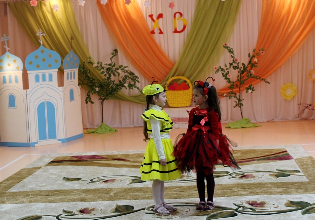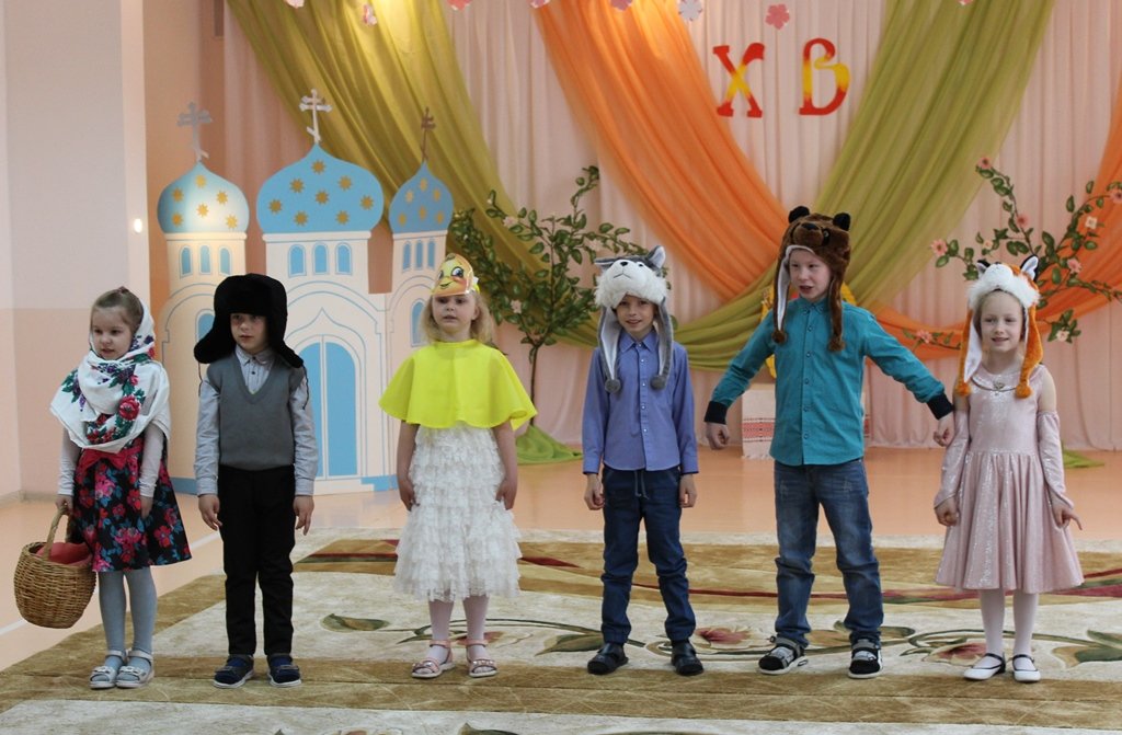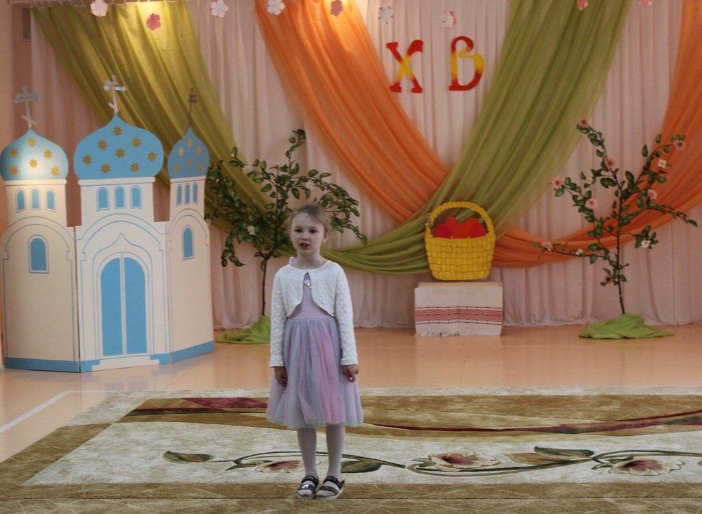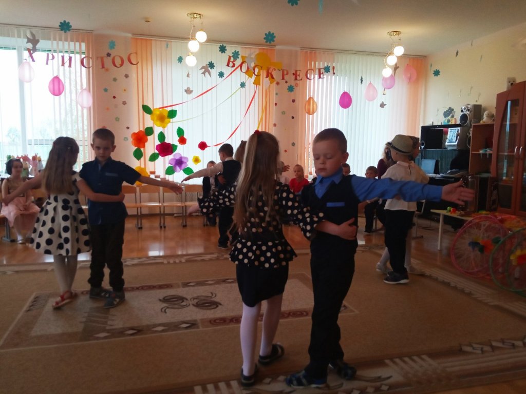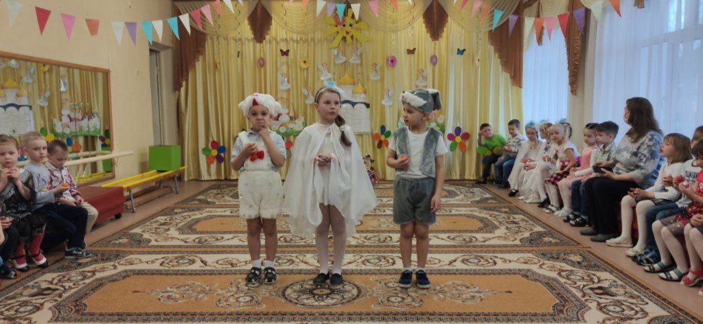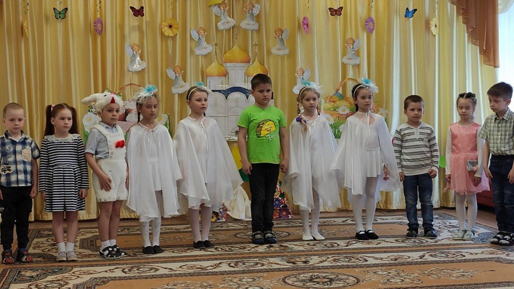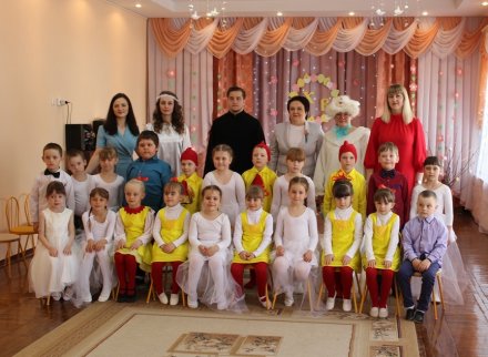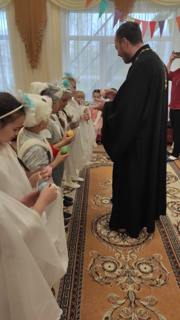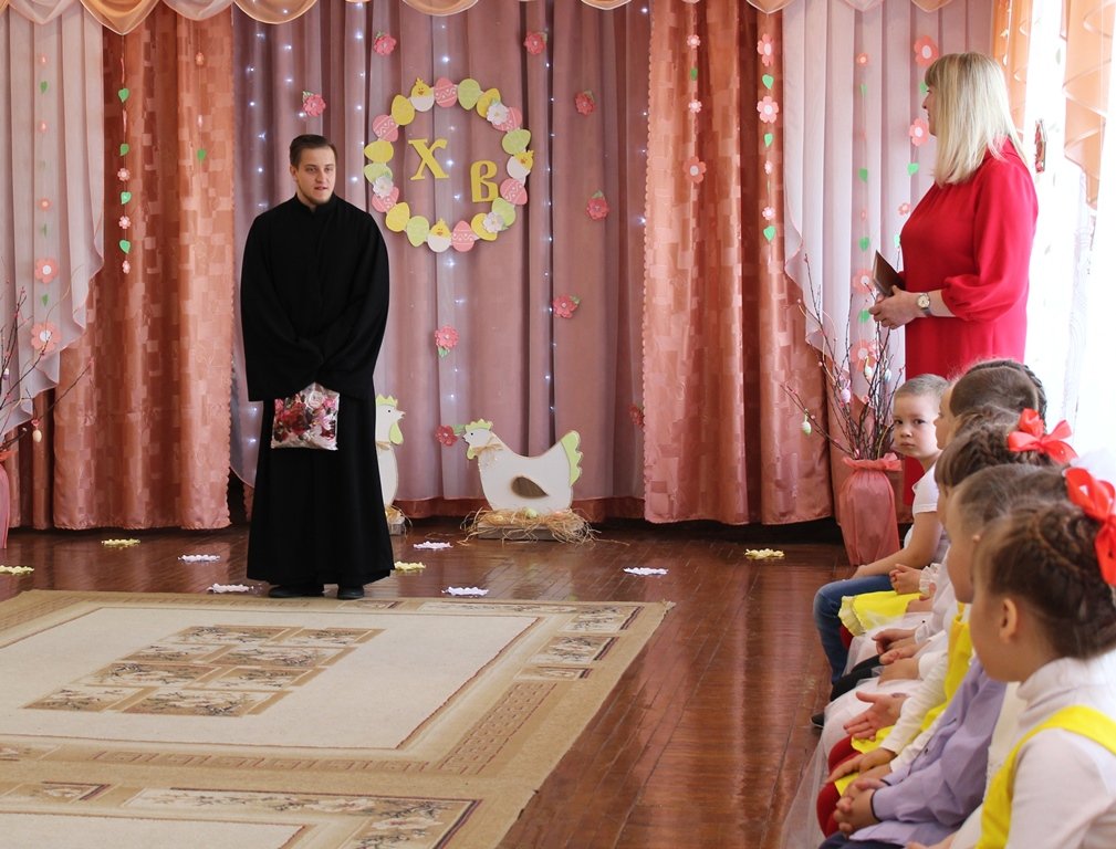 Праздничное представление "Явилась радость к нам с Небес, Христос Воистину Воскрес" подготовили воспитанники старшей группы яслей-сада №11г.Рогачёва. В гости к ребятам пришёл диакон Никита Кулиткин, клирик храма святого благоверного князя Александра Невского. Дети вспомнили евангельские события, предшествовавшие Пасхе, с вербочками в танце прославляли Господа, добрыми делами готовились к Светлому Христову Воскресению, помогая Маме-крольчихе вспомнить рецепт кулича и утешая Кролика песнями, танцами и подвижными играми. Помогали ребятам их воспитатель Феоктистова Наталья Сергеевна, музыкальный руководитель Заплешникова Наталья Юрьевна и педагог-психолог Головач Юлия Александровна. Когда отзвучали аплодисменты, со словами поздравления к ребятам обратились Любовь Петровна Кушнерова, заведующий учреждением образования, и диакон Никита Кулиткин. Пожелав помощи Божией, мира, добра и здоровья, он передал ребятам сладкие подарки от прихода.