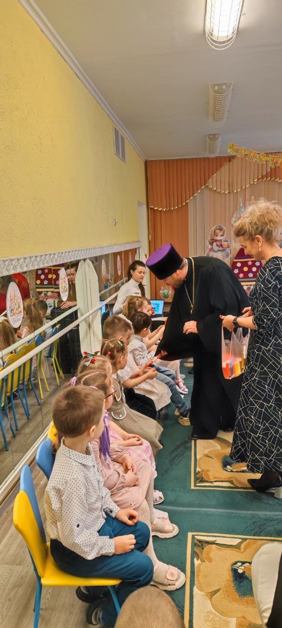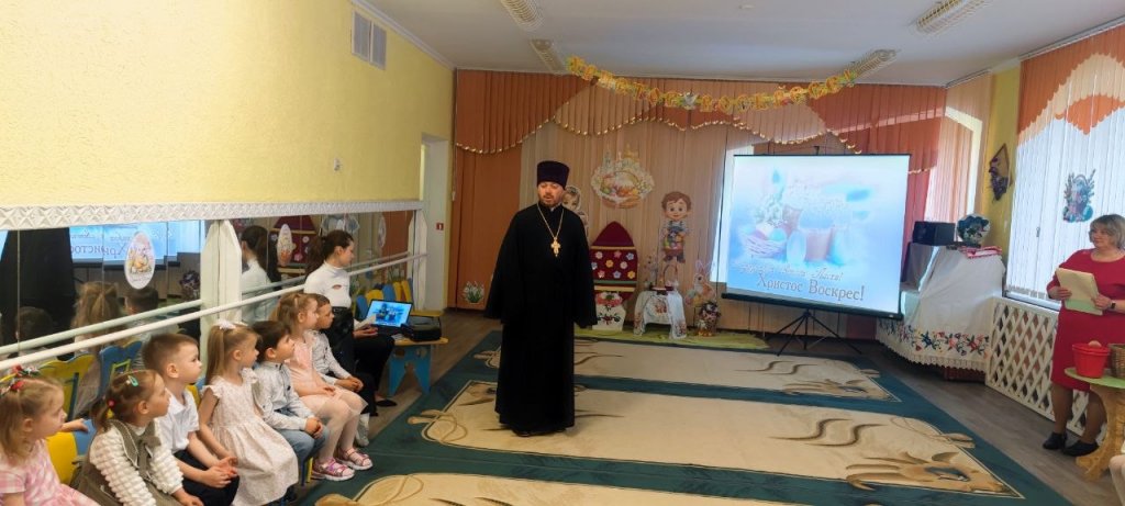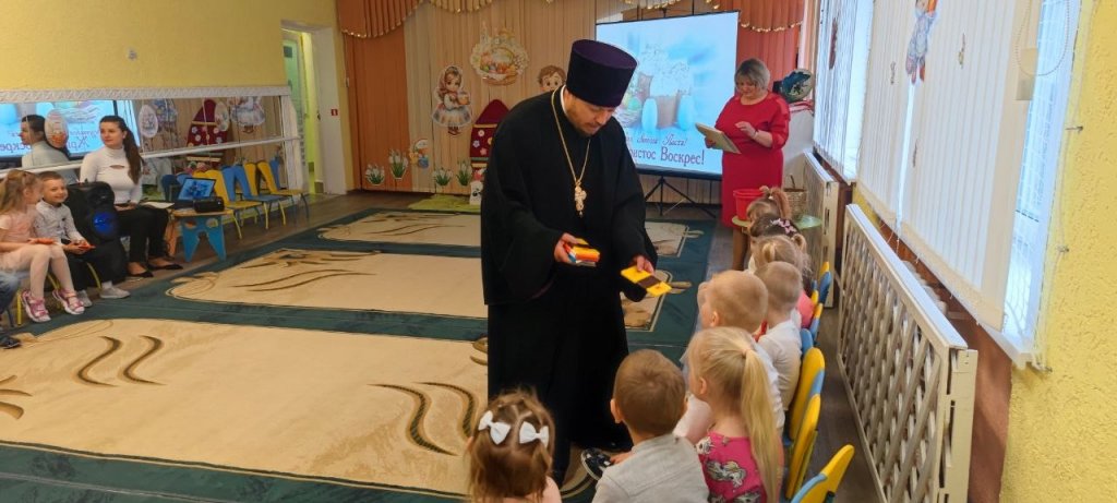В гости к воспитанникам пришёл настоятель прихода храма святителя Николая Чудотворца иерей Георгий Орловский. Батюшка поздравил детей и сотрудников учреждения с Пасхой Господней, рассказал малышам о значении этого великого праздника, о символике пасхального яйца и традициях, связанных с Воскресением Спасителя.